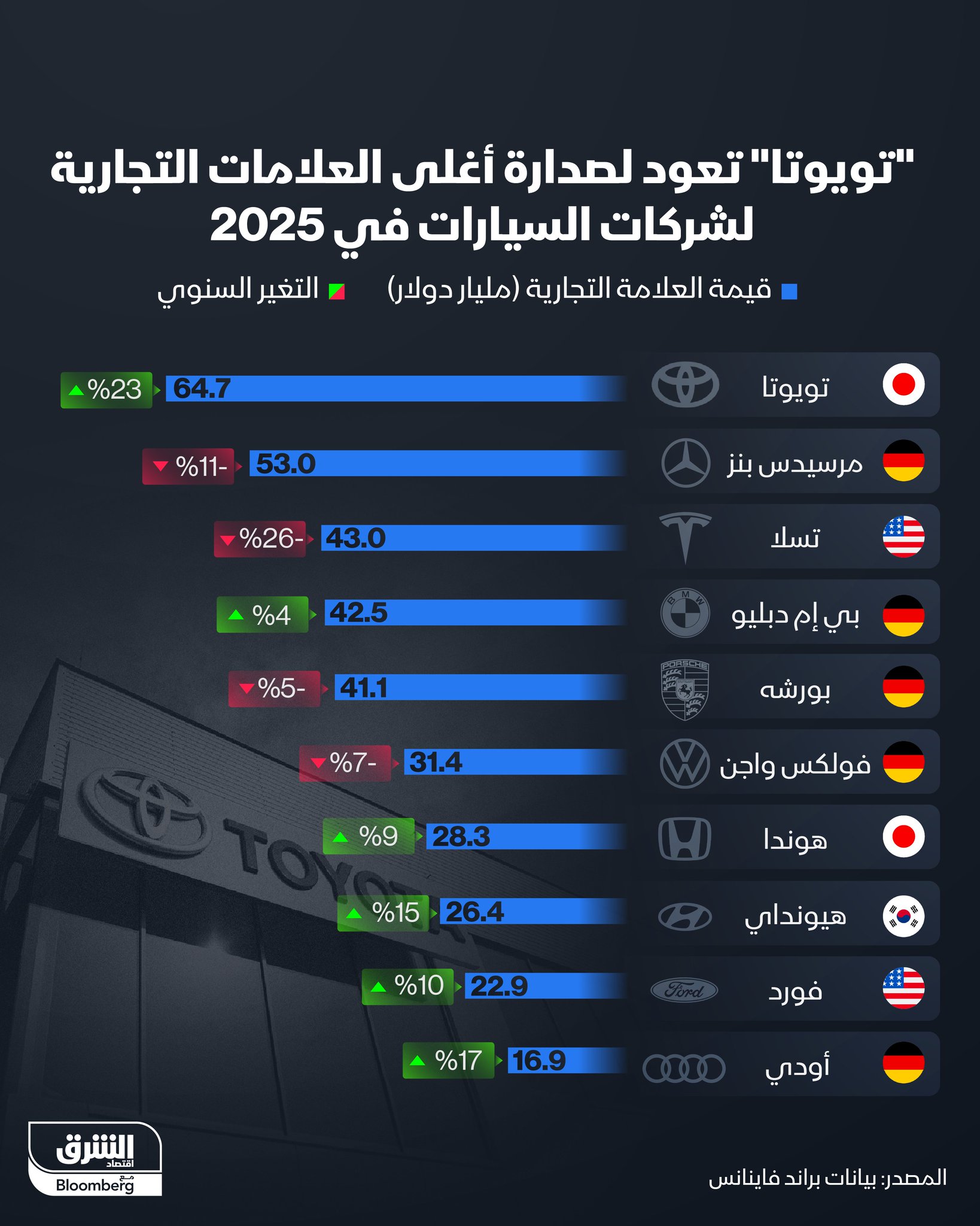 "تويوتا" تتصدر أغلى العلامات التجارية لشركات السيارات عالميا لعام 2025، متفوقة على مرسيدس بنز و تسلا.. إليك أبرز التغيرات بالقائمة #اقتصاد_الشرق