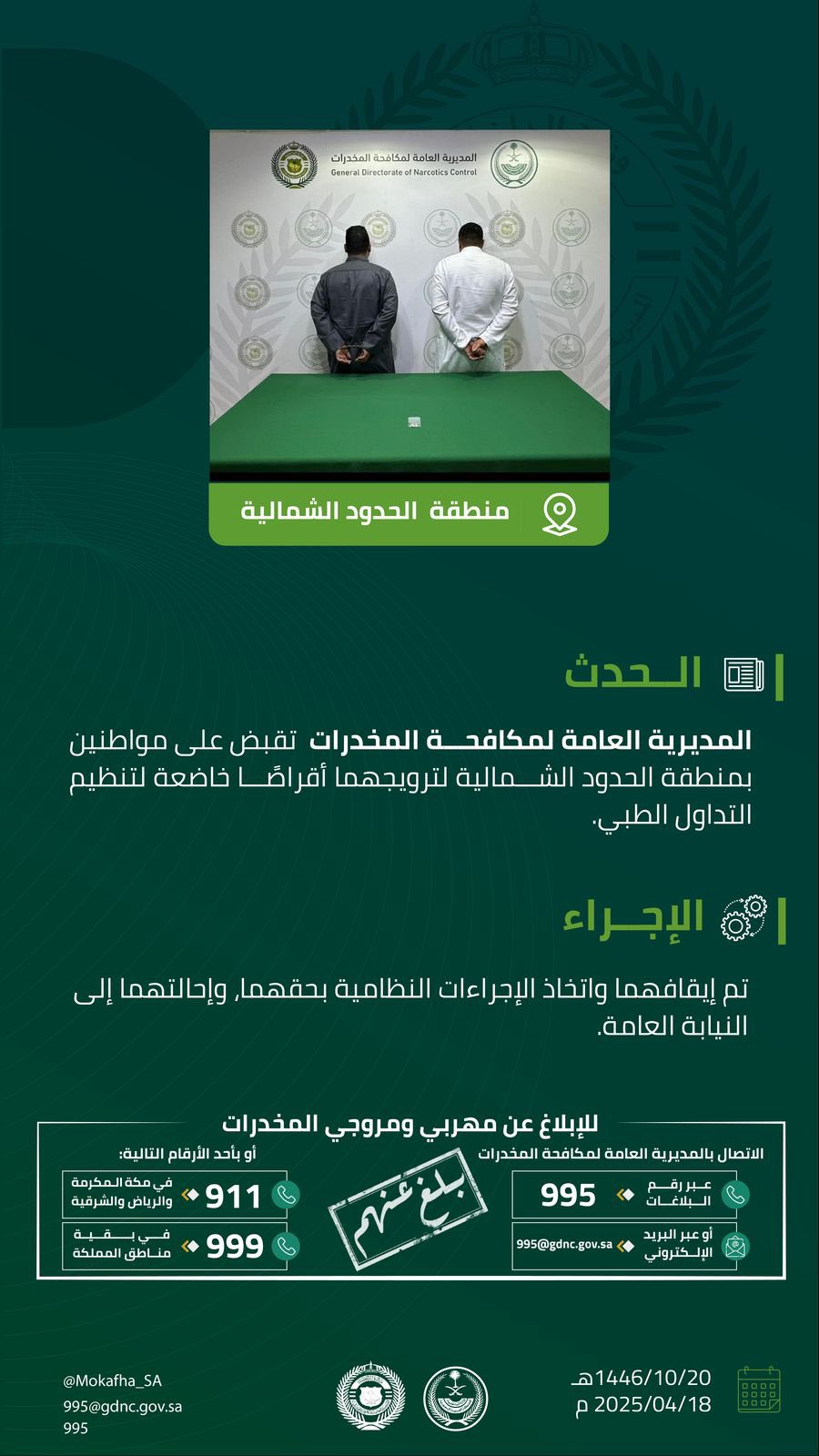 قبضت المديرية العامة لمكافحة المخدرات على مواطنين بمنطقة الحدود الشمالية لترويجهما أقراصًا خاضعة لتنظيم التداول الطبي، وأوقفا واتخذت الإجراءات النظامية بحقهما، وأحيلا إلى النيابة العامة.