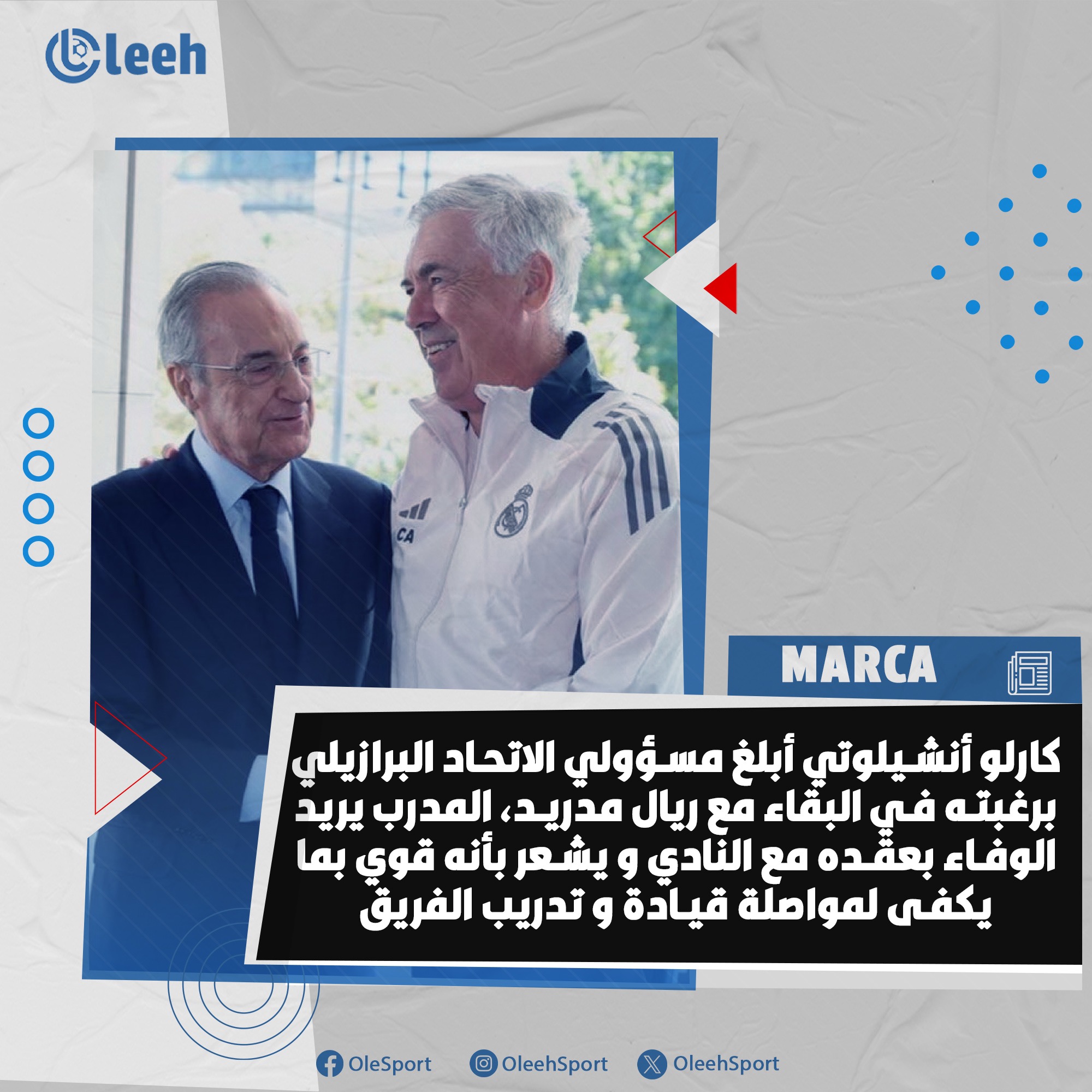 ماركا | كارلو أنشيلوتي أبلغ مسؤولي الاتحاد البرازيلي برغبته في البقاء مع ريال مدريد.. الإيطالي يريد الوفاء بعقده مع ريال مدريد ويشعر بأنه قوى بما يكفي لمواصلة قيادة وتدريب الفريق