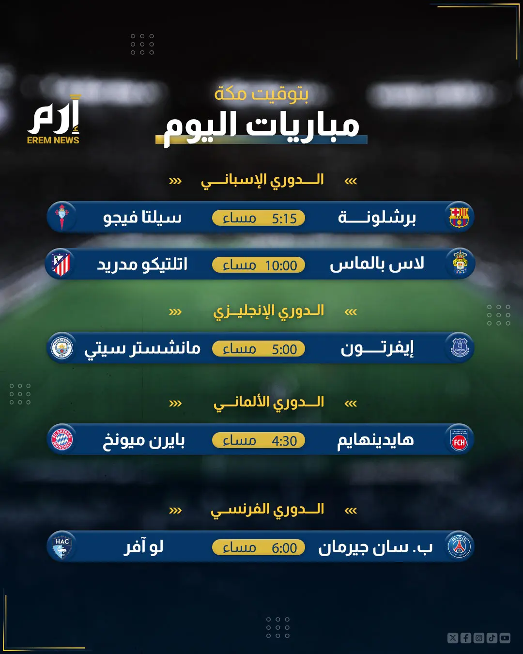وفي البريمرليغ ينزل مانشستر سيتي ضيفا على إيفرتون، بينما يلعب بايرن ميونخ في البوندسليغا ضد هايدنهايم.