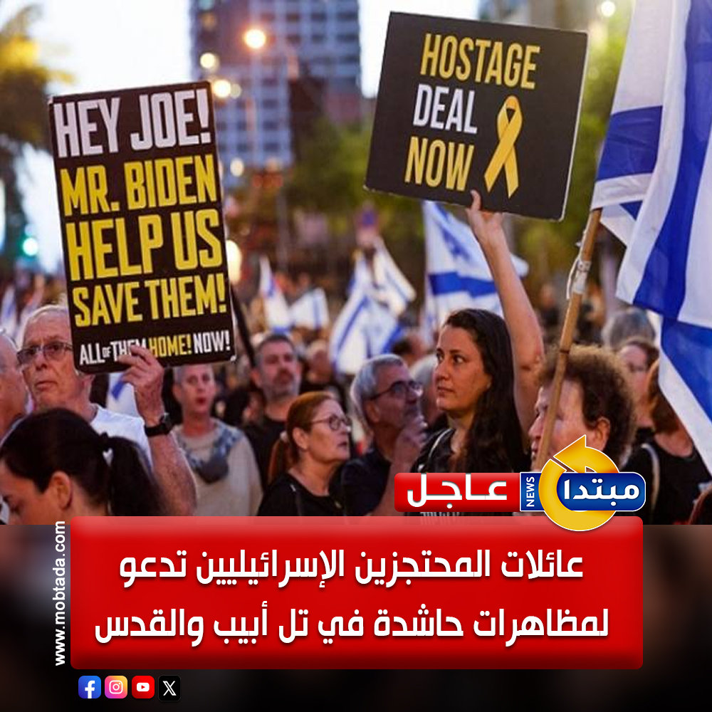 دعت هيئة عائلات المحتجزين الإسرائيليين، منذ قليل، إلى مظاهرات حاشدة في تل أبيب والقدس المحتلة مساء اليوم السبت، للضغط على حكومة بنيامين نتنياهو من أجل عقد صفقة تبادل، حسبما نقلت قناة "القاهرة الإخبارية" في نبأ عاجل، منذ قليل.
