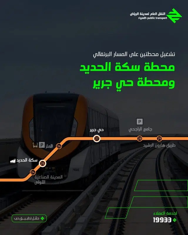 أعلنت هيئة النقل العام لمدينة الرياض، تشغيل محطتيْن جديدتيْن ضمن مسار القطار البرتقالي، وهما محطة سكة الحديد ومحطة حي جرير، في خطوةٍ تعزّز من كفاءة شبكة النقل وتسهّل تنقل السكان في أحياء العاصمة.