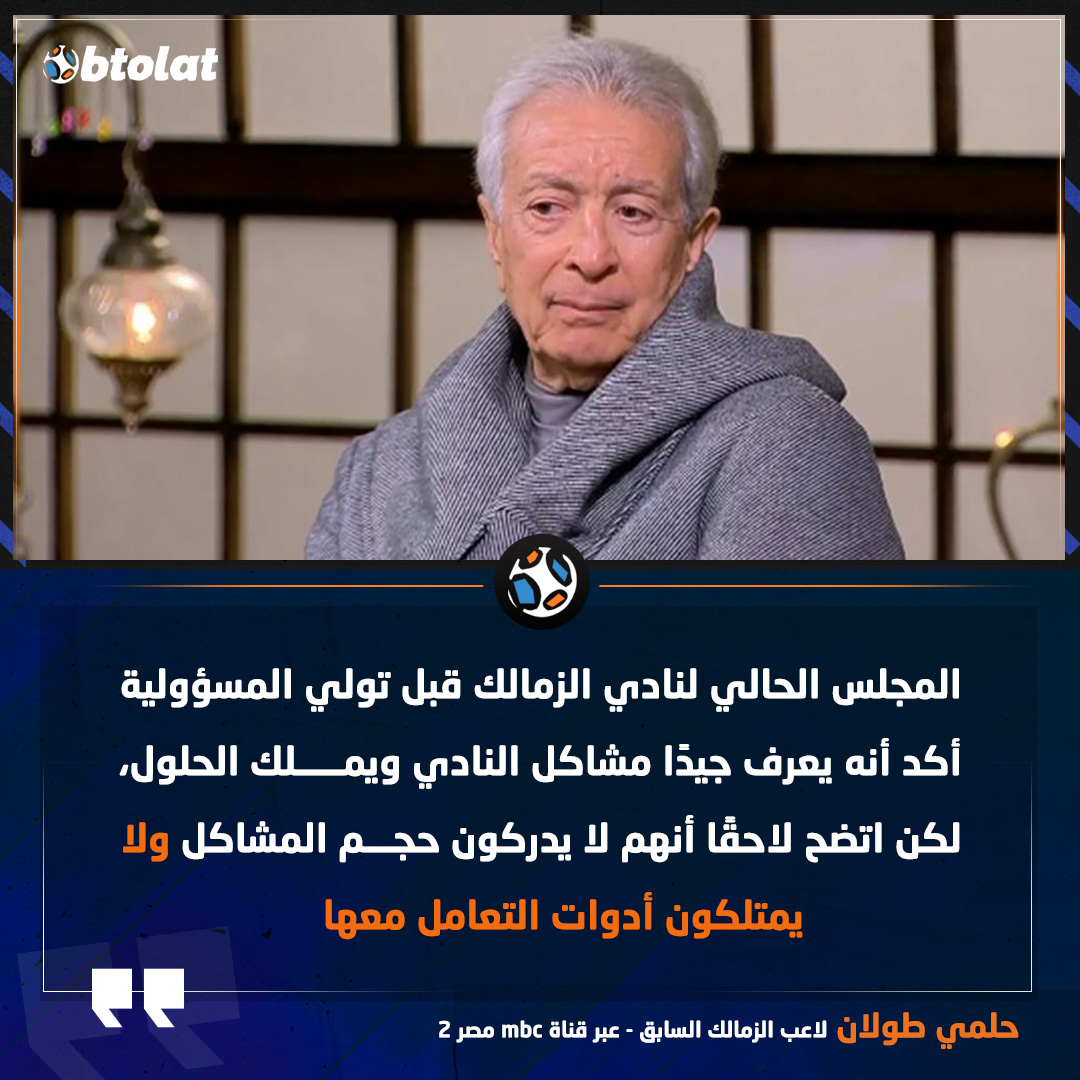 حلمي طولان: المجلس الحالي لنادي الزمالك قبل تولي المسؤولية أكد أنه يعرف جيدًا مشاكل النادي ويملك الحلول، لكن اتضح لاحقًا أنهم لا يدركون حجم المشاكل ولا يمتلكون أدوات التعامل معها