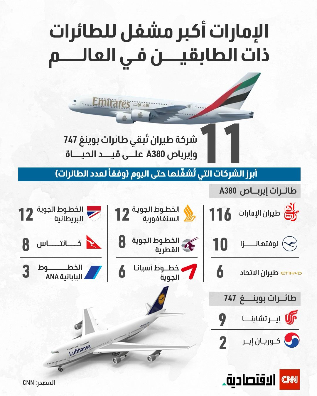 الإمارات تتصدر قائمة أبرز الشركات المشغّلة للطائرات ذات الطابقين في العالم #العالم_بلغة_الأعمال
