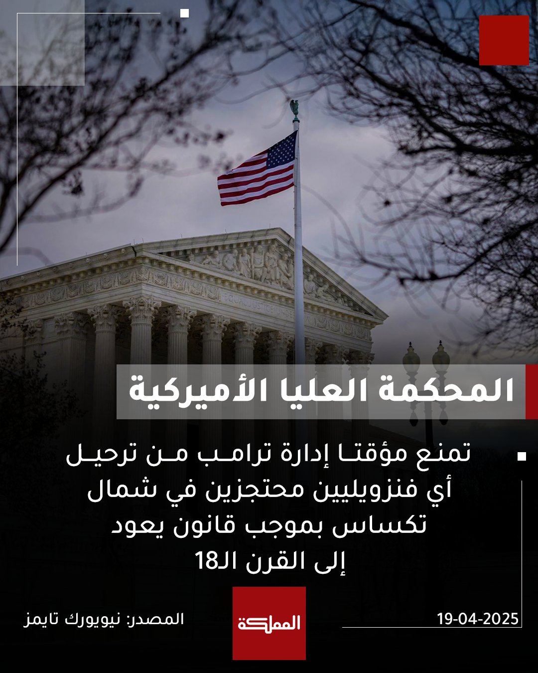 نيويورك تايمز: المحكمة العليا الأميركية تمنع مؤقتا إدارة ترامب من ترحيل أي فنزويليين محتجزين في شمال تكساس بموجب قانون يعود إلى القرن ال18 #الولايات_المتحدة