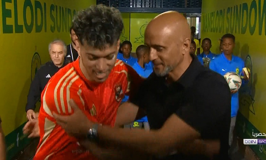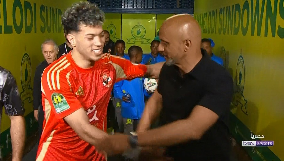 مصافحة بين إمام عاشور وكاردوزو مدرب صن داونز قبل بداية الشوط الثاني في ذهاب نصف نهائي دوري أبطال إفريقيا