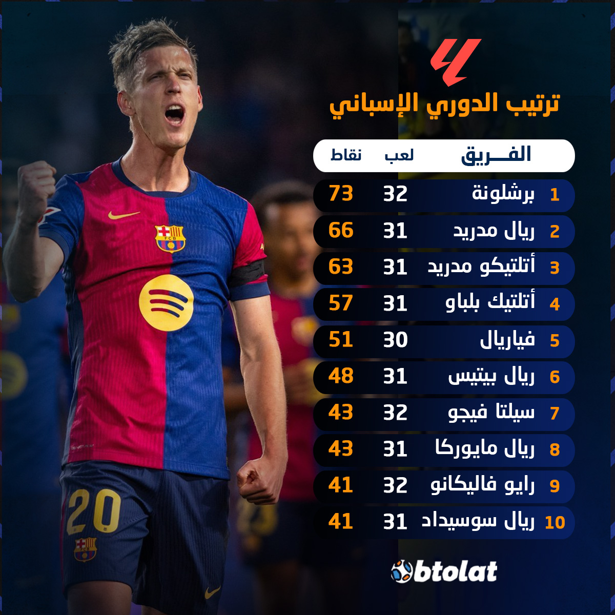 البارسا يواصل التحليق في الصدارة منفردًا بعد اقتناص ثلاث نقاط هامة من سيلتا فيجو. برشلونة يقترب خطوة أكثر من تحقيق لقب الدوري الإسباني.. إليكم ترتيب الليجا