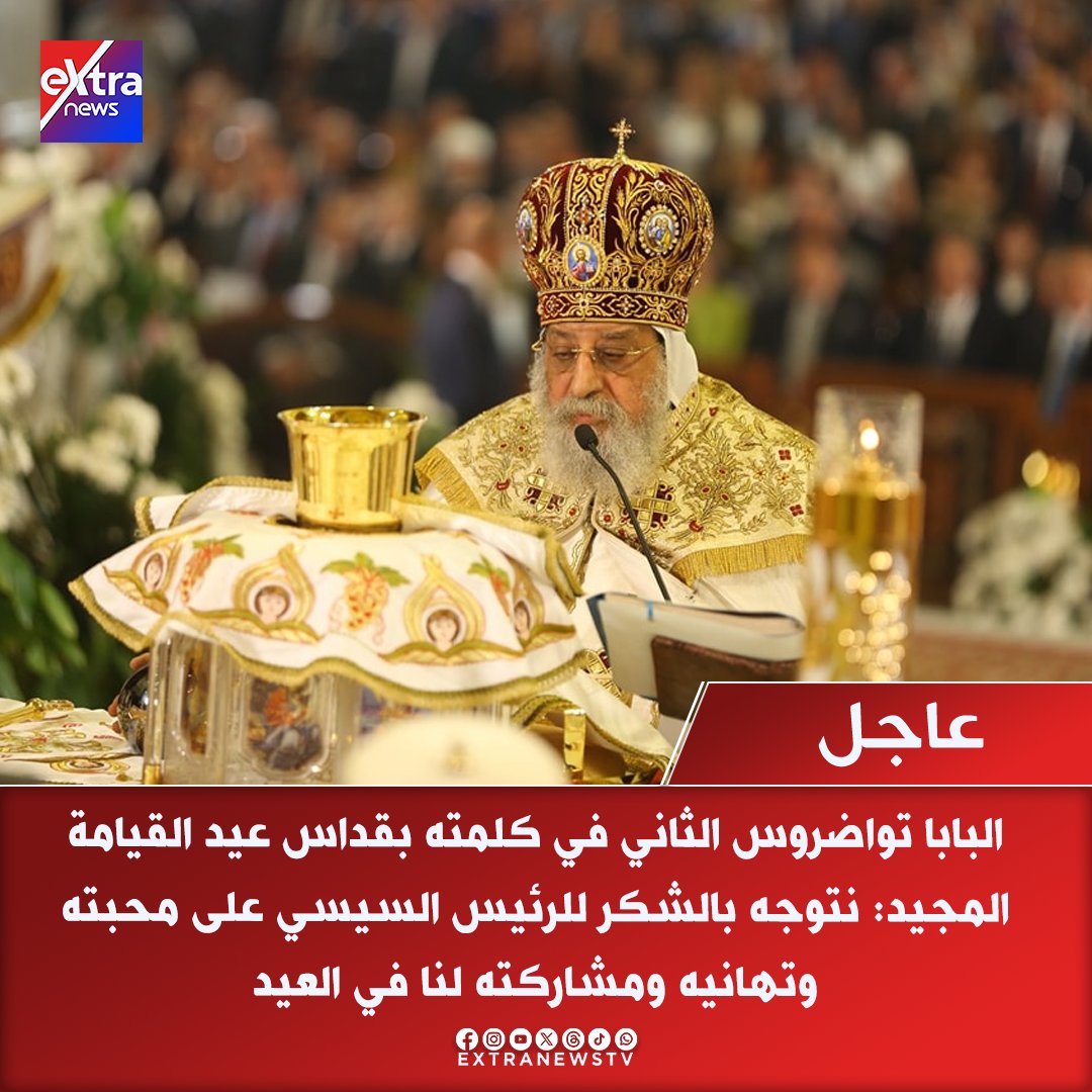 عاجل| البابا تواضروس الثاني في كلمته بقداس عيد القيامة المجيد: نتوجه بالشكر للرئيس السيسي على محبته وتهانيه ومشاركته لنا في العيد