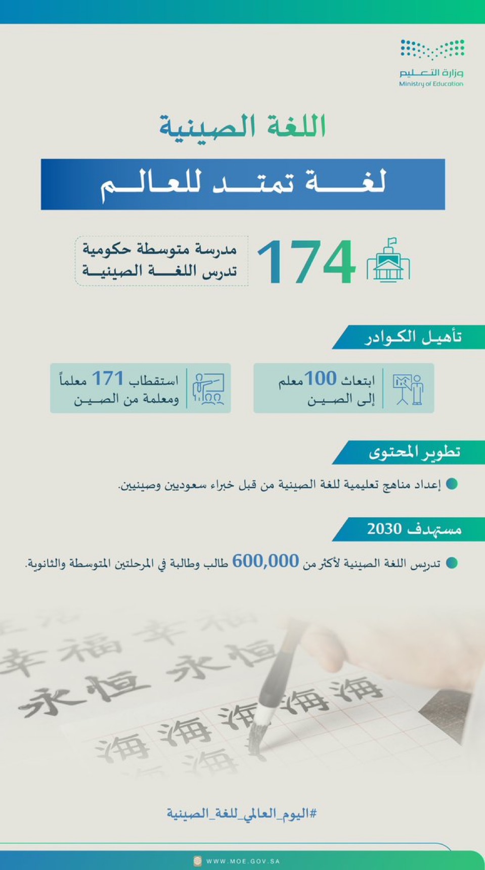 وزارة التعليم: 174 مدرسة متوسطة حكومية تدرّس اللغة الصينية في #المملكة