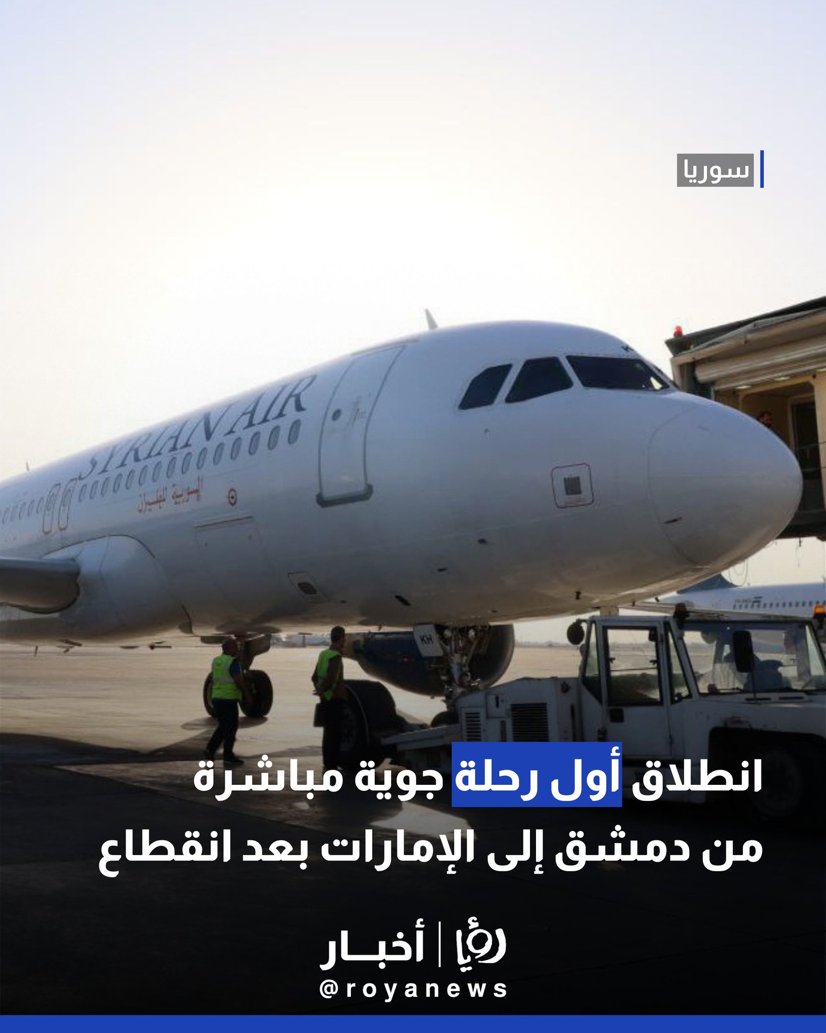 غادرت، صباح الأحد، أول طائرة ركاب من مطار دمشق الدولي متجهةً إلى دولة الإمارات العربية المتحدة، لتكون بذلك أول رحلة جوية مباشرة بين البلدين بعد انقطاع استمر لأشهر.