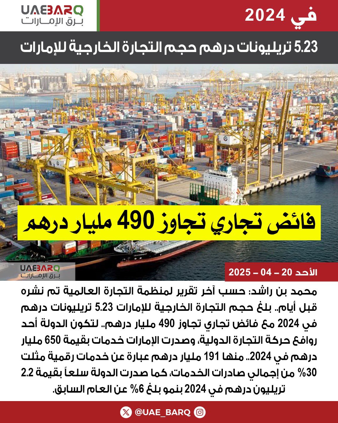محمد بن راشد: حسب آخر تقرير لمنظمة التجارة العالمية تم نشره قبل أيام.. بلغ حجم التجارة الخارجية للإمارات 5.23 تريليونات درهم في 2024 مع فائض تجاري تجاوز 490 مليار درهم.. لتكون الدولة أحد روافع حركة التجارة الدولية، وصدرت الإمارات خدمات بقيمة 650 مليار درهم في 2024.. منها 191 مليار درهم عبارة عن خدمات رقمية مثلت 30% من إجمالي صادرات الخدمات، كما صدرت الدولة سلعاً بقيمة 2.2 تريليون درهم في 2024 بنمو بلغ 6% عن العام السابق.