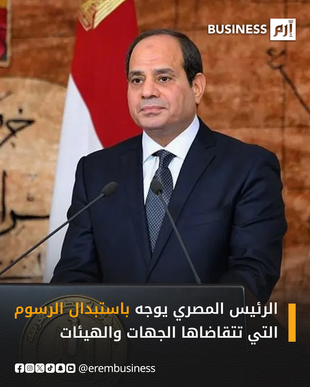 عاجل الرئيس المصري عبدالفتاح السيسي، يوجه باستبدال الرسوم التي تتقاضاها الجهات والهيئات المختلفة بضريبة إضافية موحدة من صافي الربح