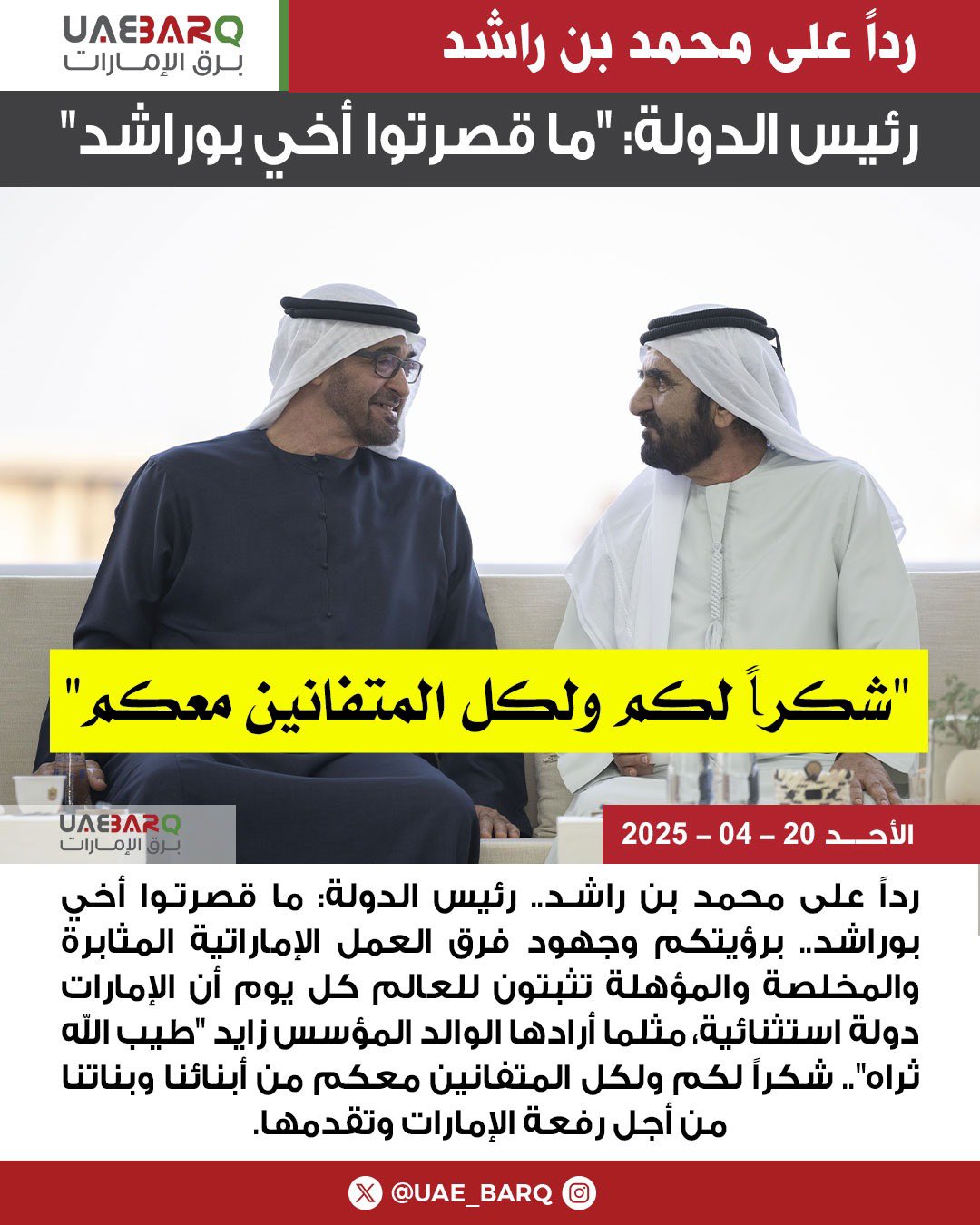 رداً على محمد بن راشد.. رئيس الدولة: ما قصرتوا أخي بوراشد.. برؤيتكم وجهود فرق العمل الإماراتية المثابرة والمخلصة والمؤهلة تثبتون للعالم كل يوم أن الإمارات دولة استثنائية، مثلما أرادها الوالد المؤسس زايد "طيب الله ثراه".. شكراً لكم ولكل المتفانين معكم من أبنائنا وبناتنا من أجل رفعة الإمارات وتقدمها.