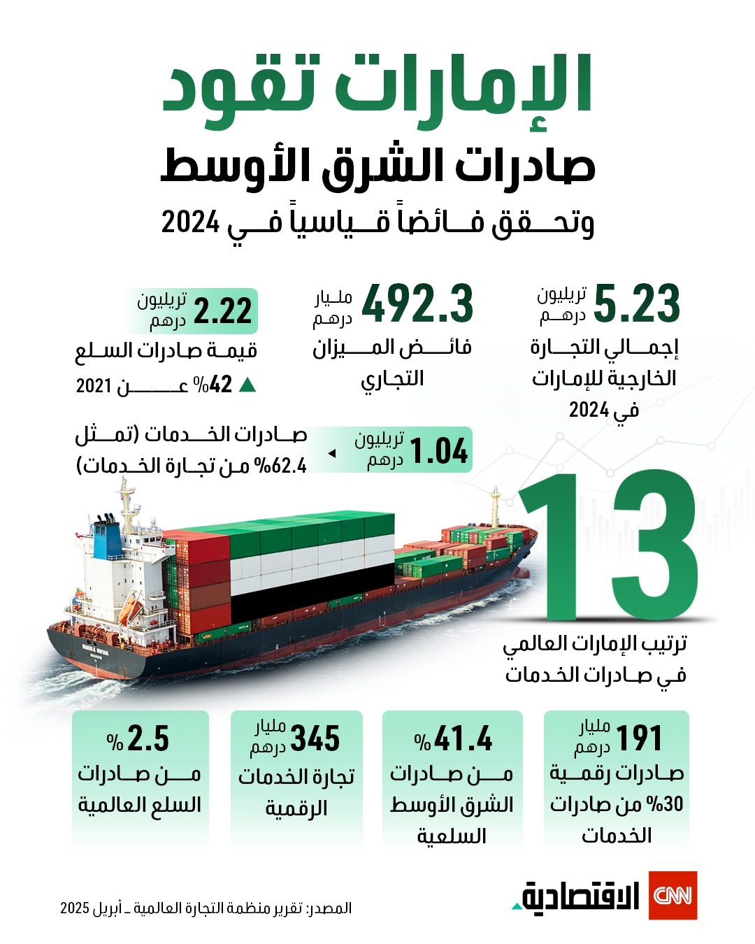 بلغ إجمالي التجارة الخارجية ل الإمارات 5.23 تريليون درهم في 2024. وقيمة صادرات السلع قفزت إلى 2.22 تريليون درهم. وفائض الميزان التجاري وصل إلى 492.3 مليار درهم #العالم_بلغة_الأعمال