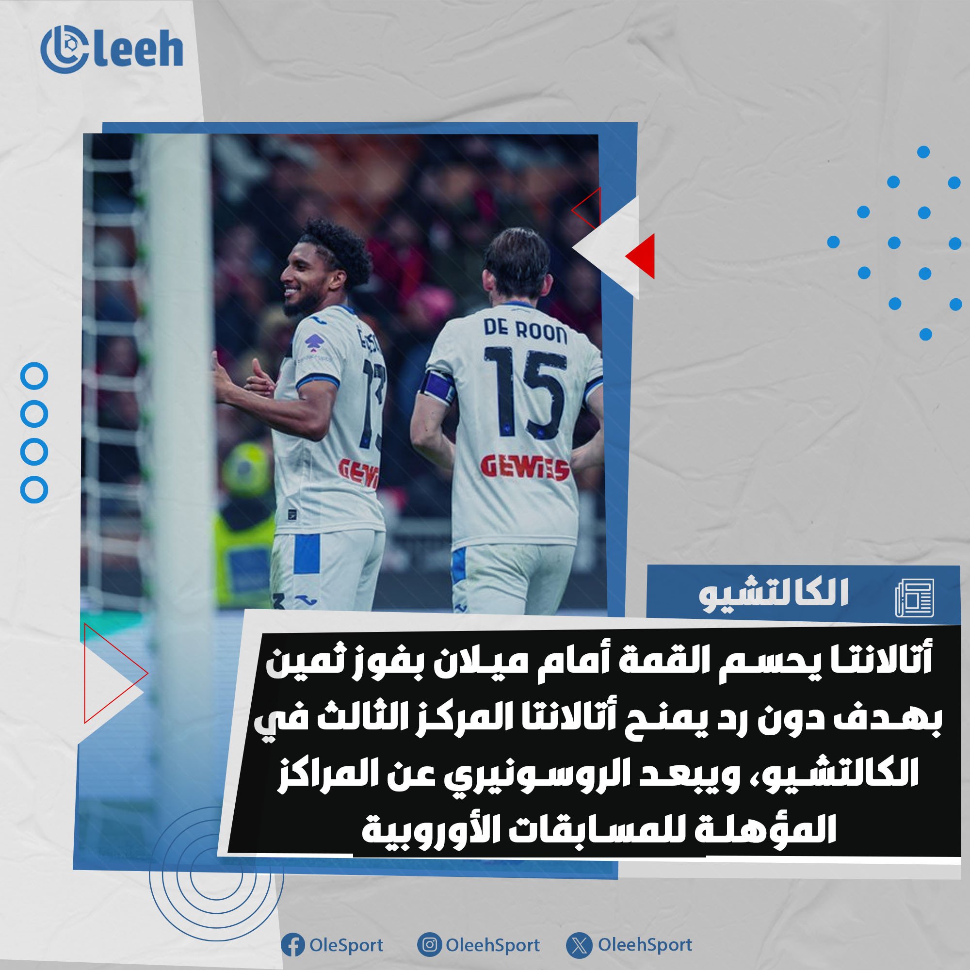 أتالانتا يحسم القمة أمام ميلان بفوز ثمين بهدف دون رد يمنح أتالانتا المركز الثالث في الكالتشيو، ويبعد الروسونيري عن المراكز المؤهلة للمسابقات الأوروبية. ميلان في ورطة... هل يفقد كل شيء هذا الموسم؟