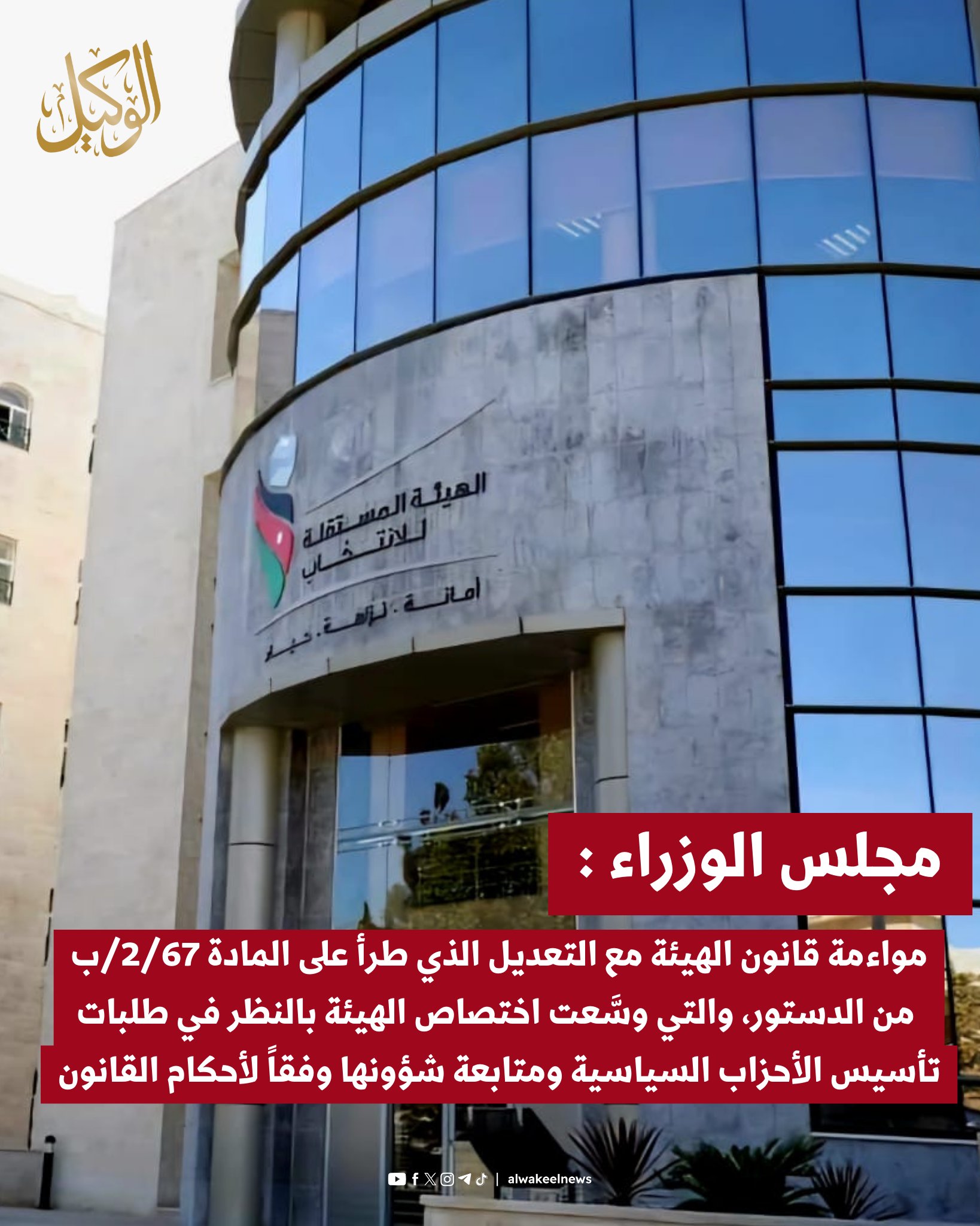 قرَّر مجلس الوزراء الموافقة على الأسباب الموجبة لمشروع قانون معدل لقانون الهيئة المستقلة للانتخاب لسنة 2025 #الاردن