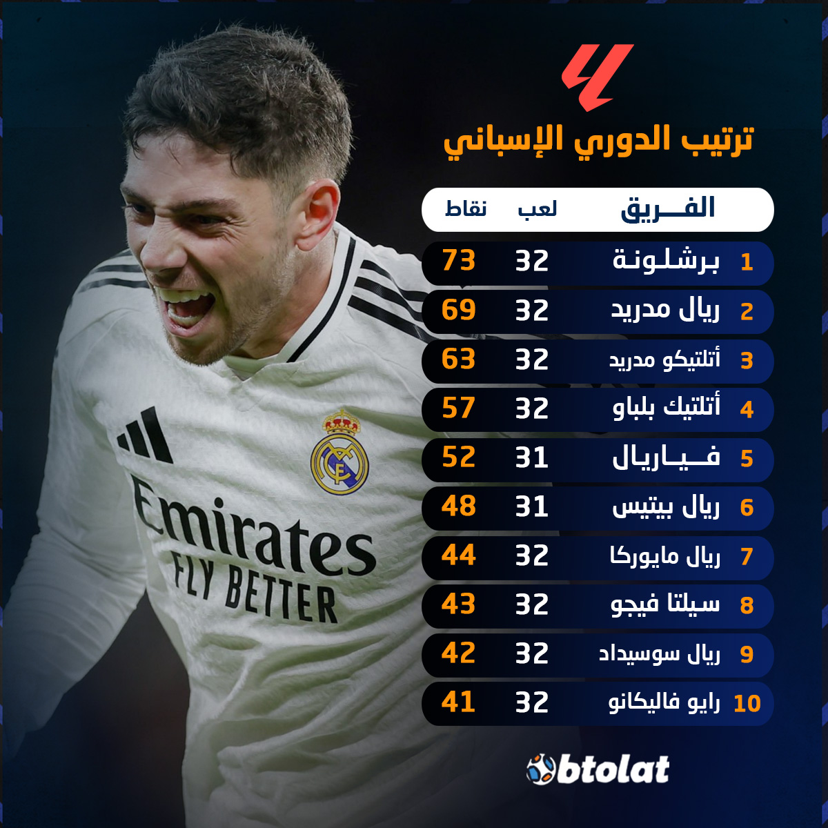 ترتيب الدوري الإسباني بعد فوز ريال مدريد على أتلتيك بلباو. فالفيردي يبقي الملكي في المنافسة