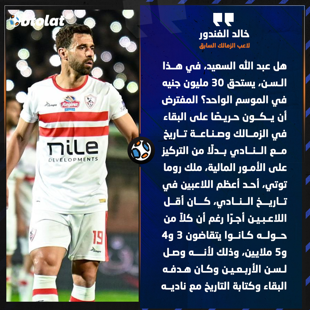 خالد الغندور: هل عبد الله السعيد، في هذا السن، يستحق هذه الأرقام؟ ملك روما توتي، كان أقل اللاعبين أجرًا رغم أن كلاً من حوله كانوا يتقاضون 3 و4 و5 ملايين، وذلك لأنه وصل لسن الأربعين وكان هدفه البقاء وكتابة التاريخ مع ناديه