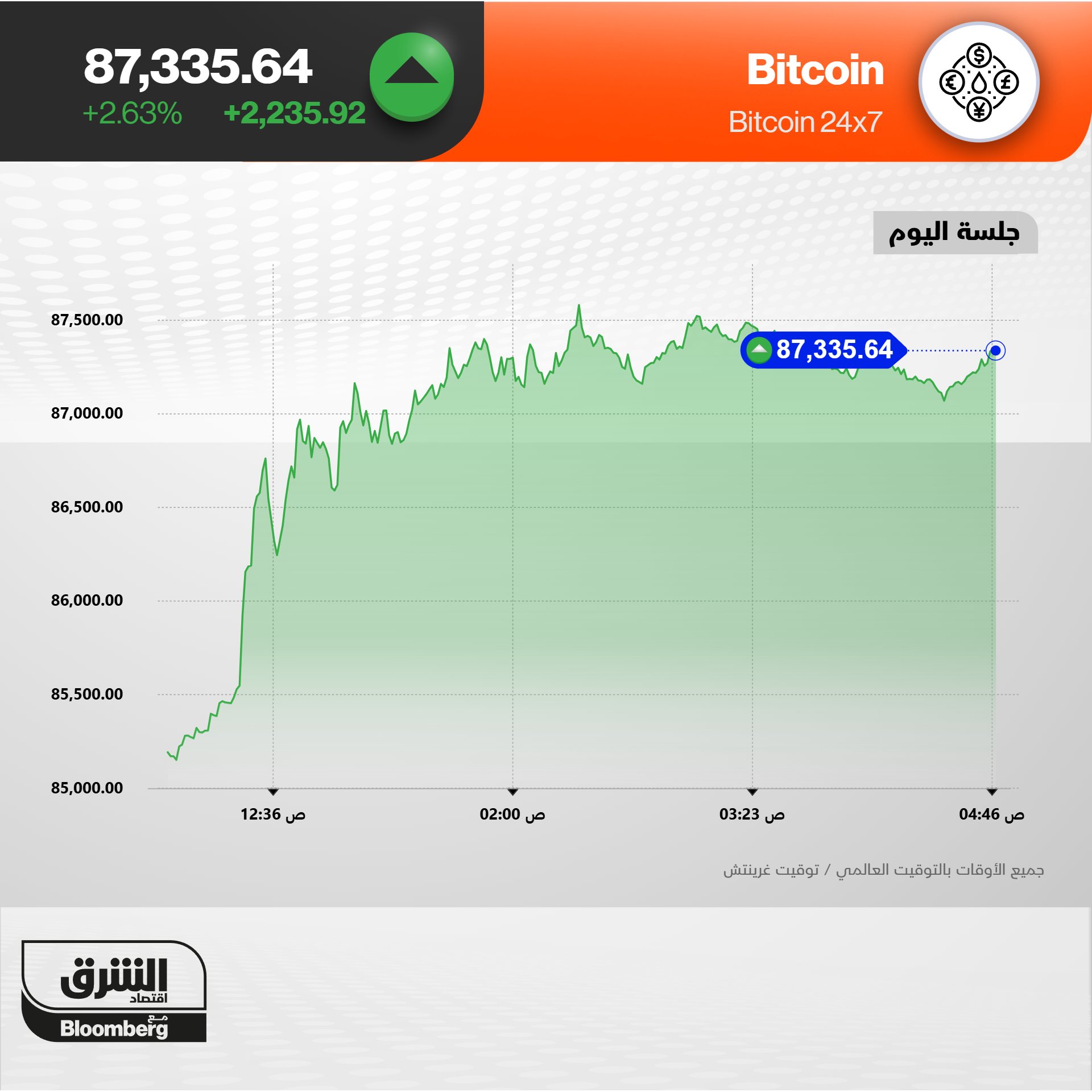 سعر بتكوين يرتفع في تعاملات اليوم الإثنين لأعلى مستوى منذ قرار ترمب فرض التعريفات الجمركية - العملة المشفرة الأكبر عالميا من حيث القيمة السوقية ارتفعت بنحو 2.6% لتتداول فوق 87.3 ألف دولار #اقتصاد_الشرق