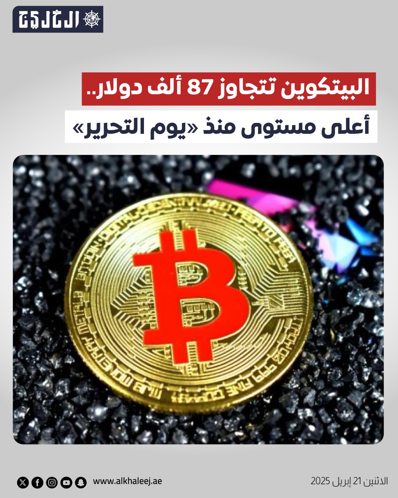 ارتفعت عملة البيتكوين إلى أعلى مستوى لها منذ إعلان ترامب الرسوم الجمركية؛ محققة قفزة بنحو 3% لتصل إلى 87600 دولار صباح الاثنين.