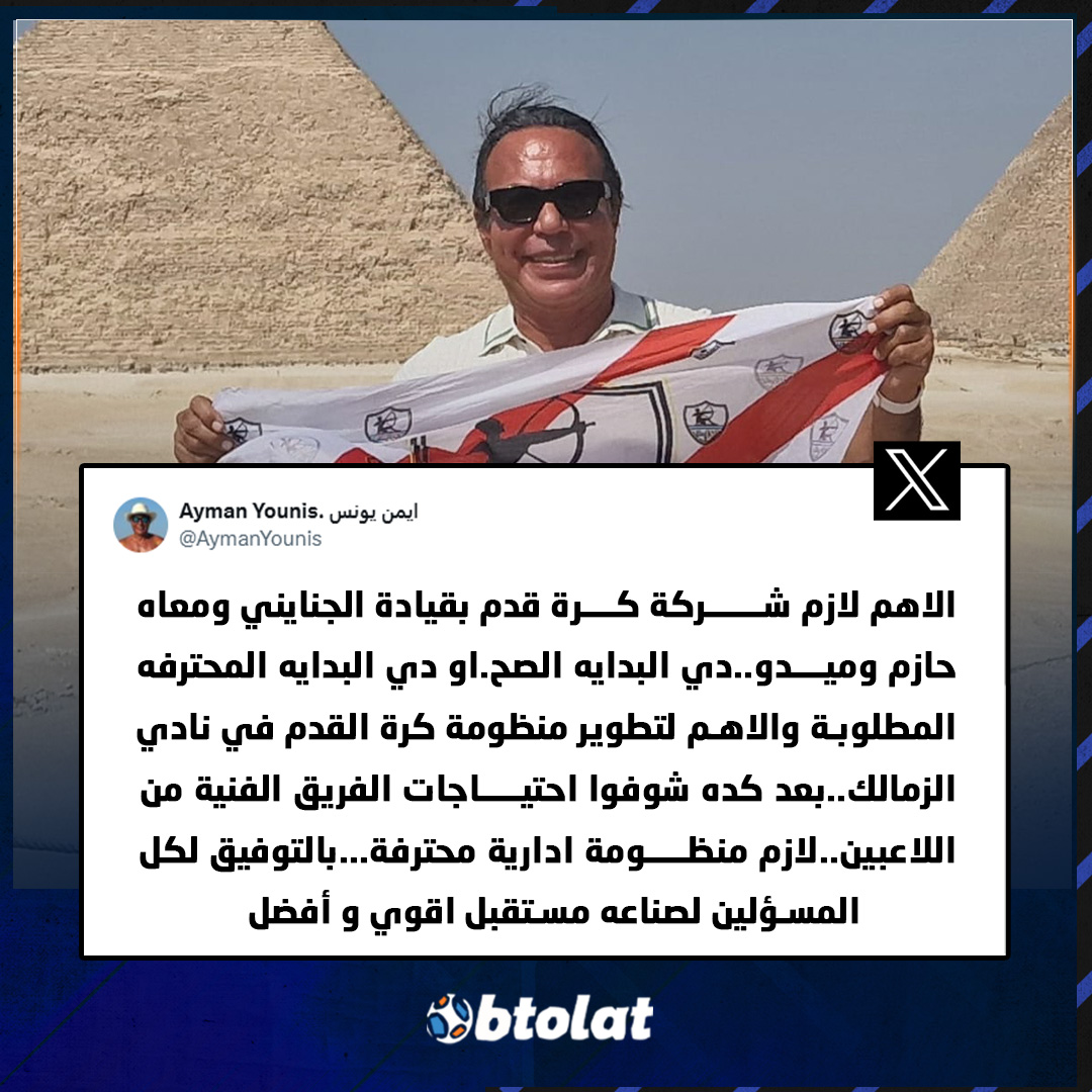 أيمن يونس عبر منصة "X". "الاهم لازم شركة كرة قدم بقيادة الجنايني ومعاه حازم وميدو..دي البداية الصح، أو دي البداية المحترفة المطلوبة"