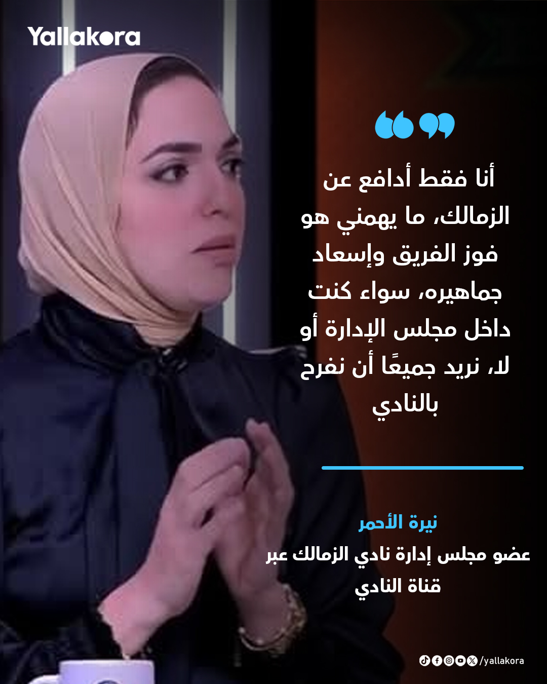 نيرة الأحمر:لا أدافع عن لاعبين أو مدربين أو مجلس الإدارة، أنا فقط أدافع عن الزمالك، ما يهمني هو فوز الفريق وإسعاد جماهيره، سواء كنت داخل مجلس الإدارة أو لا، نريد جميعًا أن نفرح بالنادي