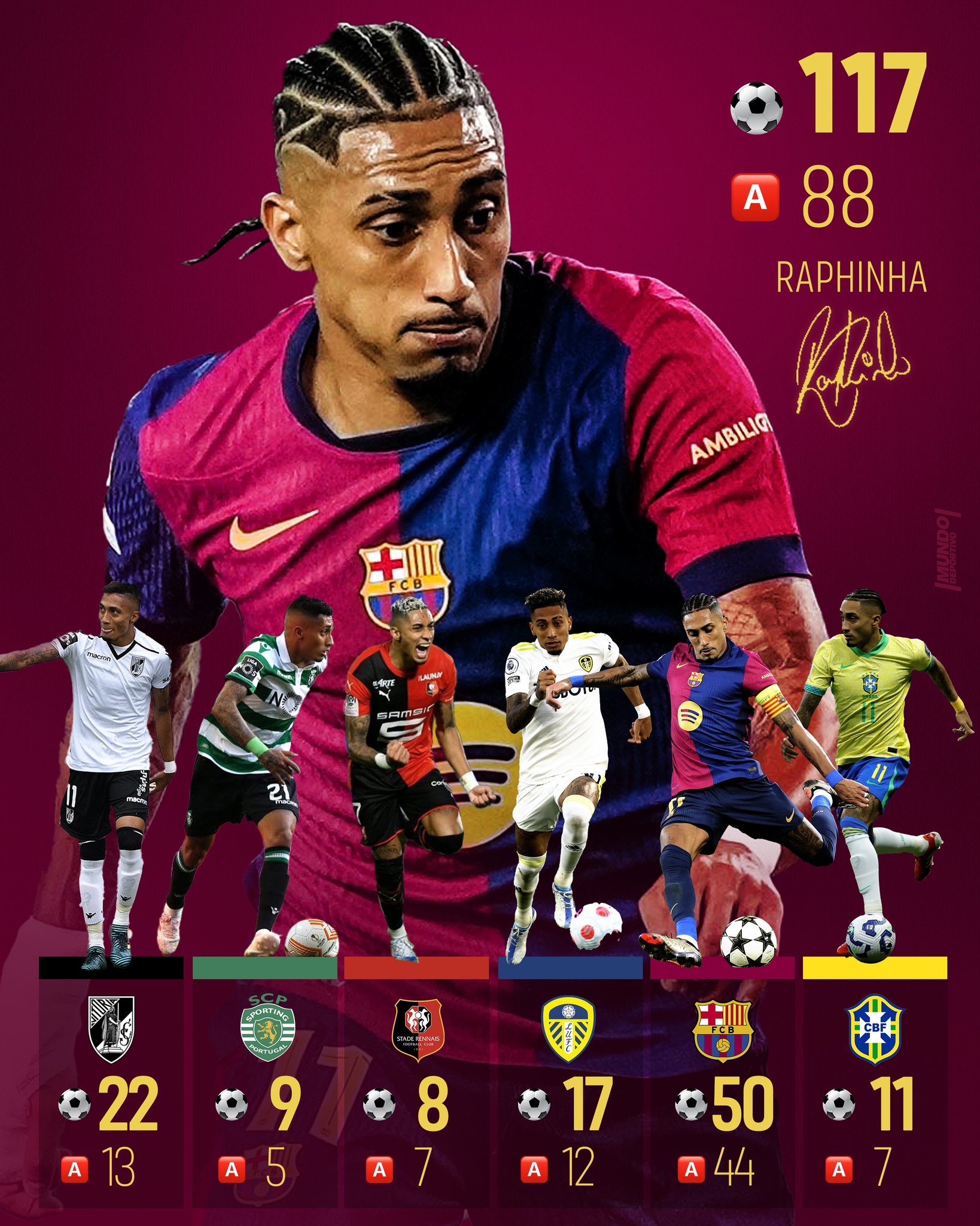 117 هدف. 88 تمريرة حاسمة. 205 مُساهمة تهديفية. رافينها في مسيرته حتى الآن مع الأندية والمُنتخب