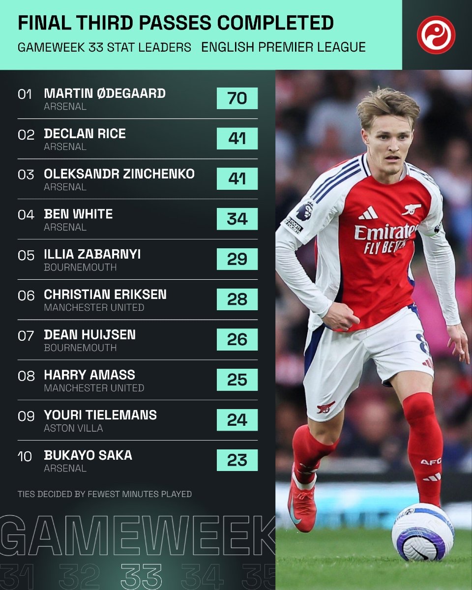 أكمل مارتن أوديغارد عددًا من التمريرات في الثلث الهجومي أكثر من أي لاعب آخر في الدوري الإنجليزي الممتاز هذا الأسبوع (70 تمريرة).. وهذا الرقم يفوق ما حققته فرق كاملة مثل إيفرتون، وولفرهامبتون، وفولهام، وكريستال بالاس، وليستر، وإيبسويتش في مبارياتهم