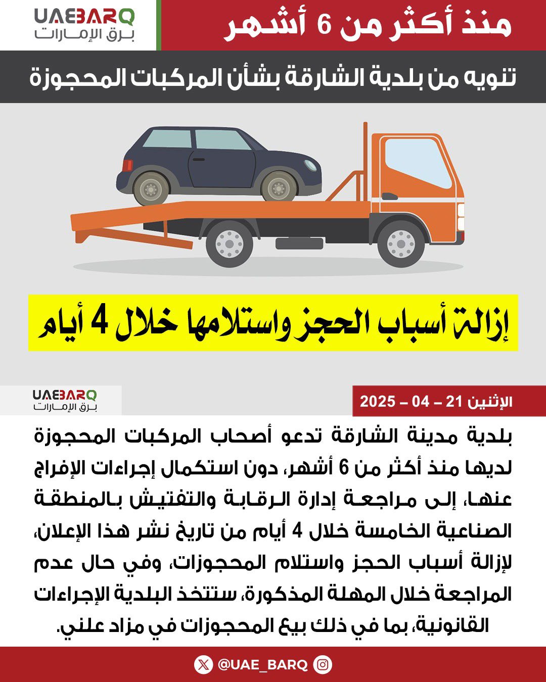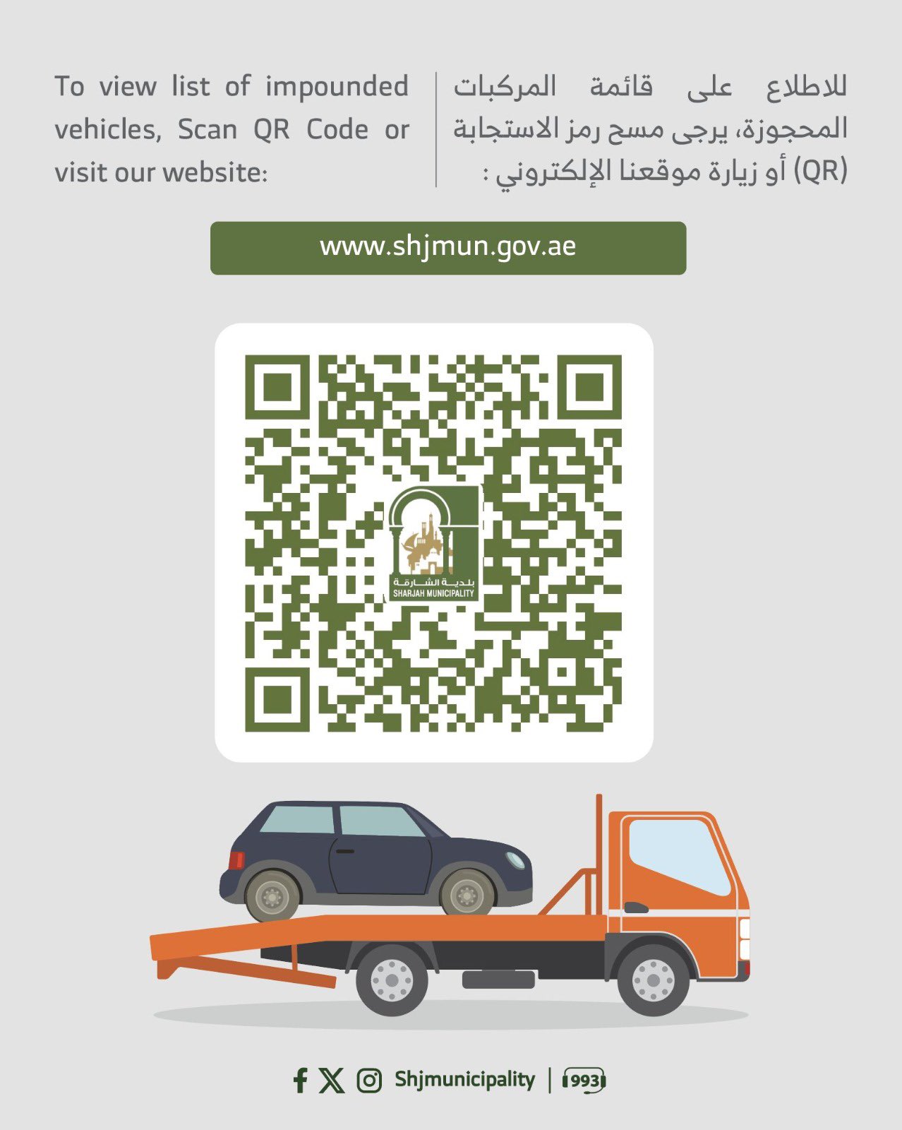 تنويه من بلدية الشارقة بشأن المركبات المحجوزة منذ أكثر من 6 أشهر.