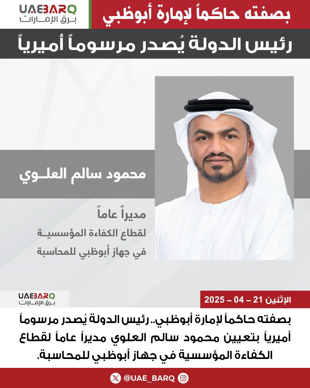 بصفته حاكماً لإمارة أبوظبي.. رئيس الدولة يُصدر مرسوماً أميرياً بتعيين محمود سالم العلوي مديراً عاماً لقطاع الكفاءة المؤسسية في جهاز أبوظبي للمحاسبة.