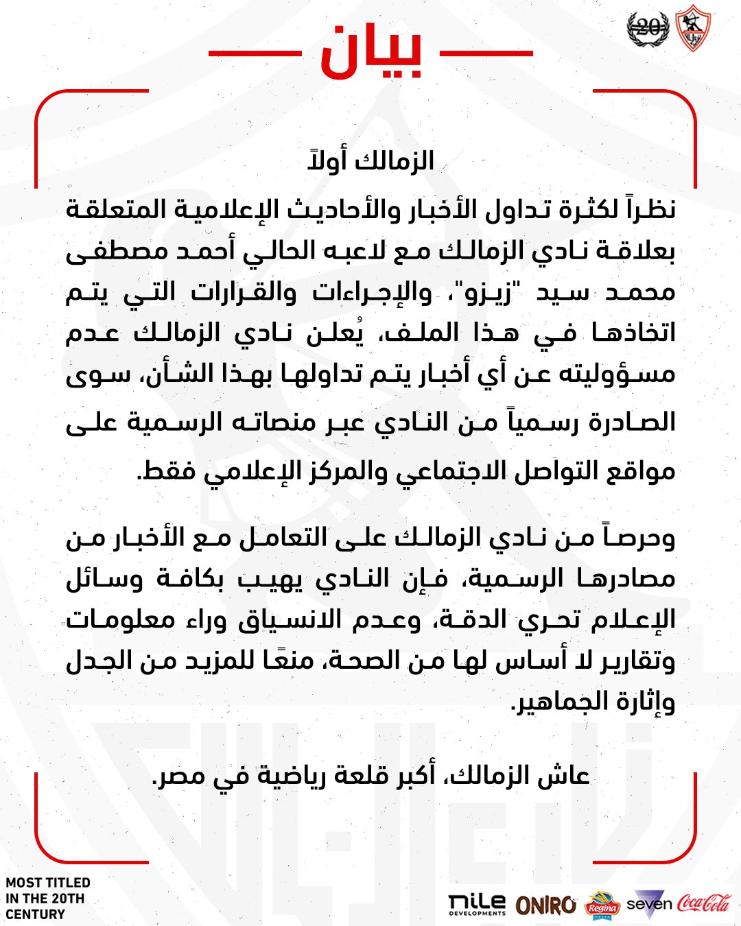 الزمالك يصدر بيانا يعلن فيه عدم مسؤوليته عن أي أخبار يتم تداولها بشأن أحمد مصطفى زيزو، سوى الصادرة رسمياً من النادي عبر منصاته الرسمية