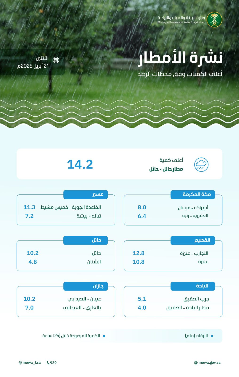 ووفقًا للتقرير اليومي الصادر عن وزارة البيئة والمياه والزراعة حول كميات هطول الأمطار في مناطق المملكة كافة؛ فقد سجّلت (43) محطة رصد هيدرولوجي ومناخي، خلال الفترة من الساعة التاسعة صباح يوم الأحد 20 أبريل وحتى التاسعة صباح يوم الاثنين 21 أبريل 2025م، هطول أمطارٍ في مناطق (مكة المكرمة، والمدينة المنورة، وعسير، والقصيم، وحائل، والرياض، والحدود الشمالية، وجازان، ونجران، والباحة).