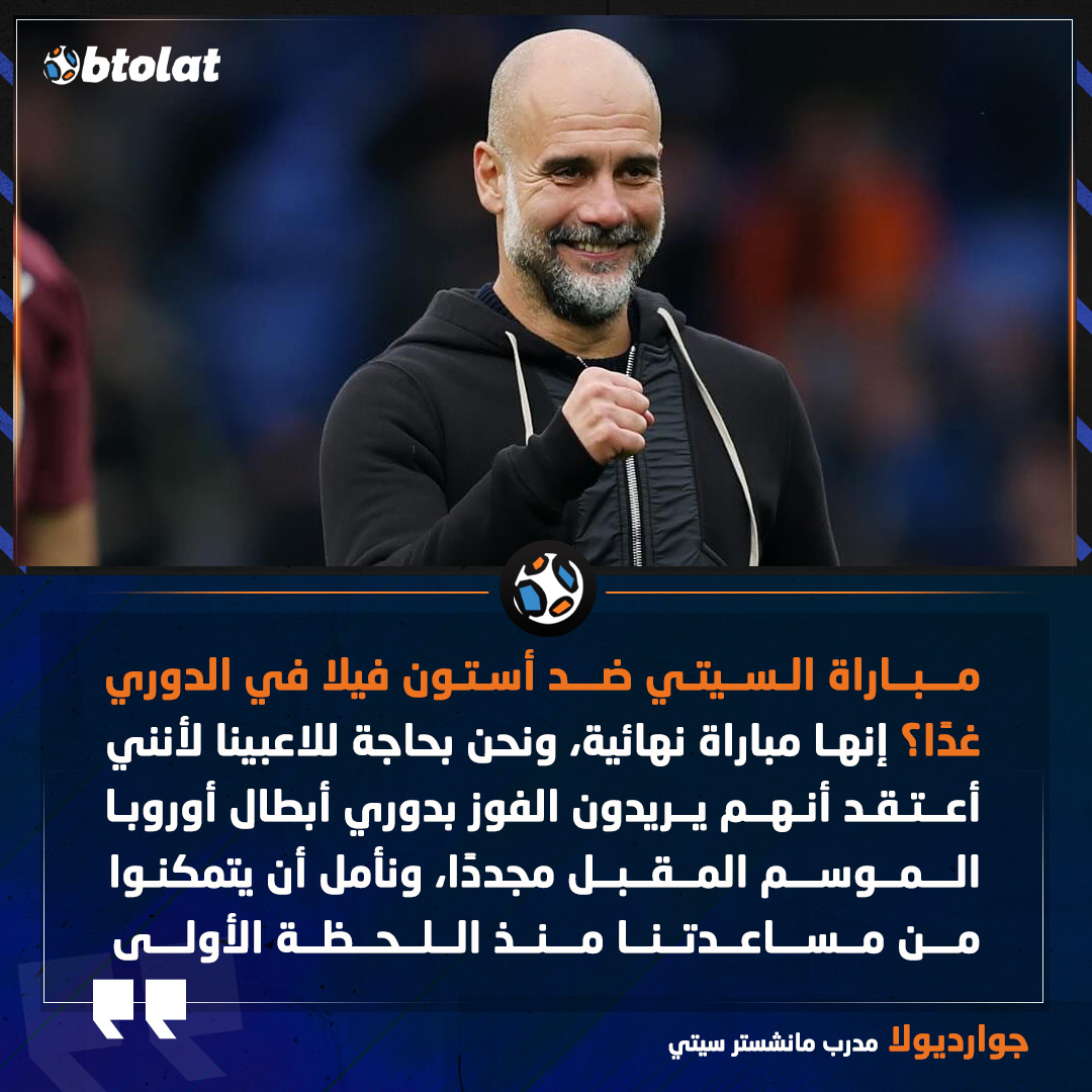 جوارديولا عن مباراة السيتي غدًا ضد أستون فيلا في الدوري الإنجليزي. إنها مباراة نهائية، ونحن بحاجة للاعبينا لأنني أعتقد أنهم يريدون الفوز بدوري أبطال أوروبا الموسم المقبل مجددًا، ونأمل أن يتمكنوا من مساعدتنا منذ اللحظة الأولى