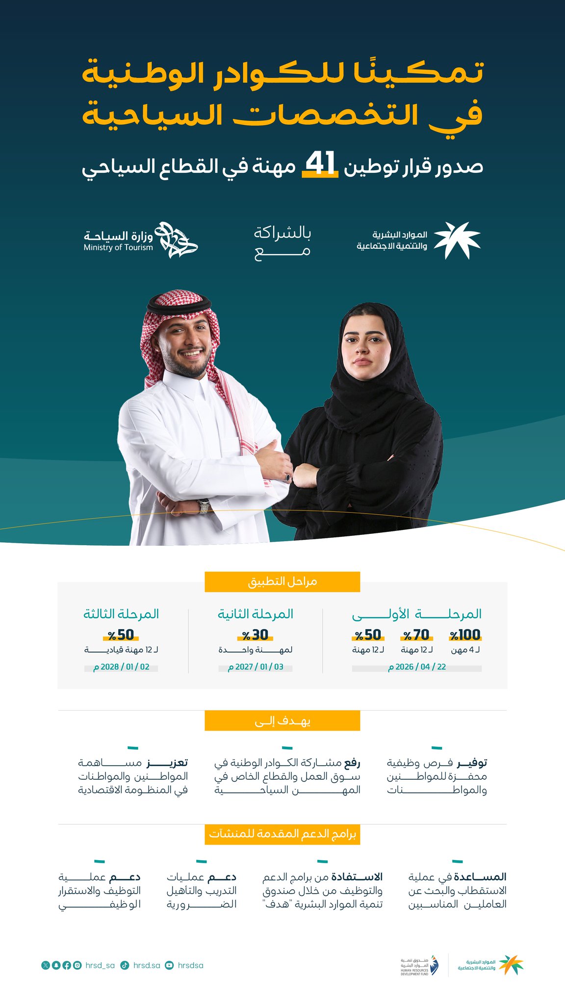 وزارة الموارد البشرية والتنمية الاجتماعية وبالشراكة مع وزارة السياحة تُصدر قرار توطين 41 مهنة في القطاع السياحي
