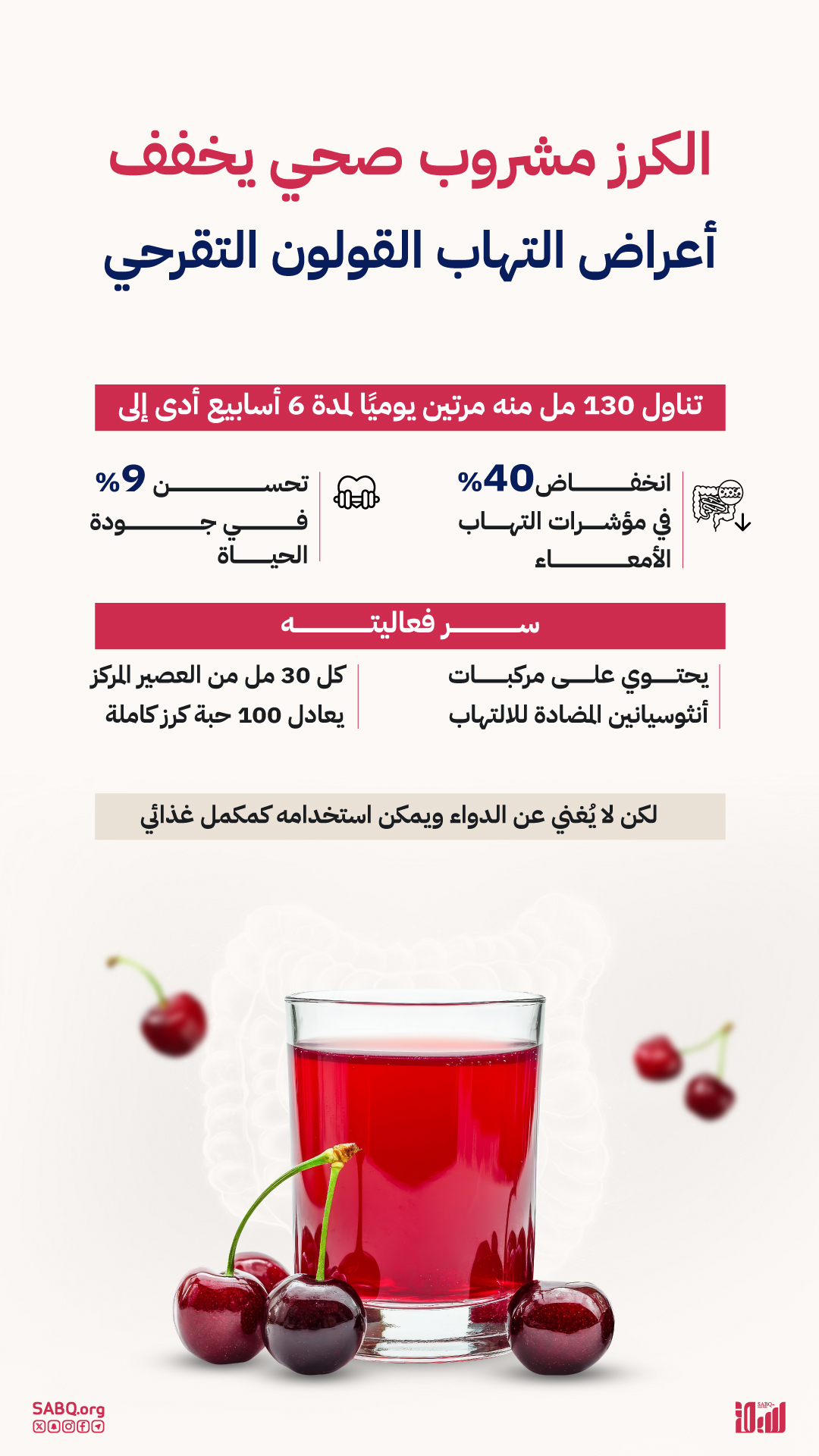 تناول عصير الكرز المخفف مرتين يومياً وأظهرت النتائج أن المرضى الذين تناولوا 130 مل من عصير الكرز المخفف مرتين يومياً لمدة ستة أسابيع، شهدوا انخفاضاً بنسبة 40% في مستويات الكالبروتكتين البرازي، وهو مؤشر رئيس على التهاب الأمعاء. كما أفاد المشاركون بتحسنٍ بنسبة 9% في جودة حياتهم الصحية العامة، وهي نتيجة ذات دلالة إيجابية للمرضى الذين يعانون هذه الحالة المزمنة.