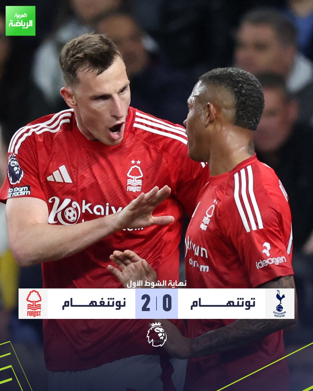 نهاية الشوط الأول بتقدم الضيوف بهدفين دون مقابل. توتنهام 0 نوتنغهام فورست 2 (أندرسون - كريس وود) الدوري الإنجليزي توتنهام هوتسبير _رياضة