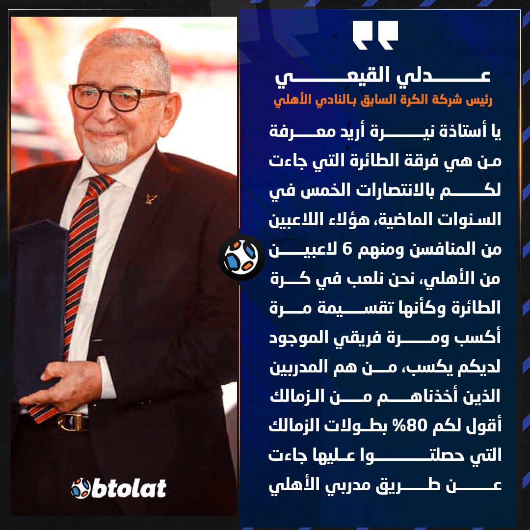 عدلي القيعي: يا أستاذة نيرة أريد معرفة من هي فرقة الطائرة التي جاءت لكم بالانتصارات الخمس في السنوات الماضية وأقول لكم 80% بطولات الزمالك التي حصلتوا عليها جاءت عن طريق مدربي الأهلي