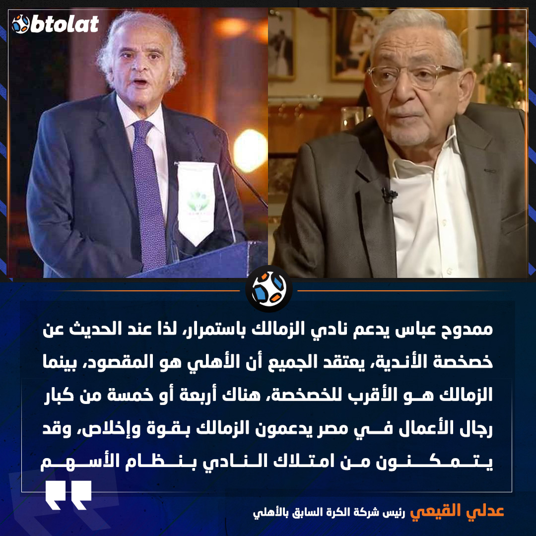 عدلي القيعي. ممدوح عباس يدعم نادي الزمالك باستمرار، لذا عند الحديث عن خصخصة الأندية، يعتقد الجميع أن الأهلي هو المقصود، بينما الزمالك هو الأقرب للخصخصة