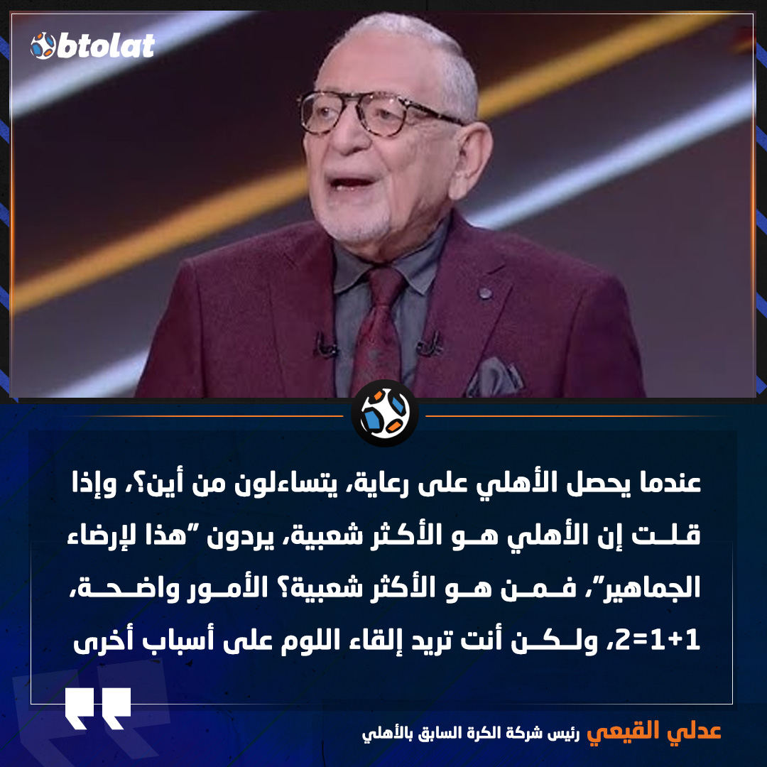 عدلي القيعي. عندما يحصل الأهلي على رعاية، يتساءلون: (من أين؟)، وإذا قلت إن الأهلي هو الأكثر شعبية، يردون (هذا لإرضاء الجماهير)، فمن هو الأكثر شعبية؟ الأمور واضحة، 1+1=2، ولكن أنت تريد إلقاء اللوم على أسباب أخرى