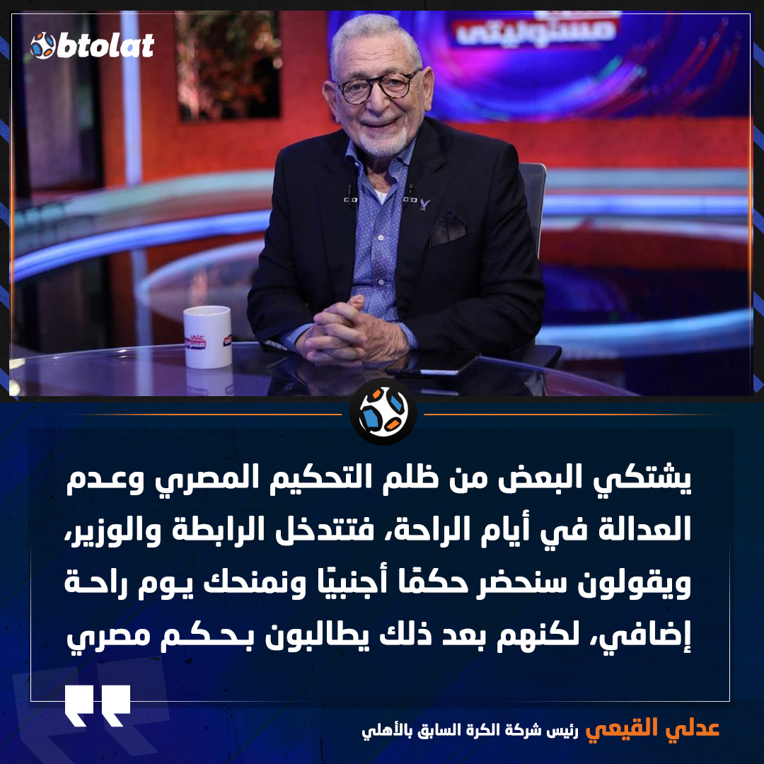 عدلي القيعي. يشتكي البعض من ظلم التحكيم المصري وعدم العدالة في أيام الراحة، فتتدخل الرابطة والوزير، ويقولون سنحضر حكمًا أجنبيًا ونمنحك يوم راحة إضافي، لكنهم بعد ذلك يطالبون بحكم مصري