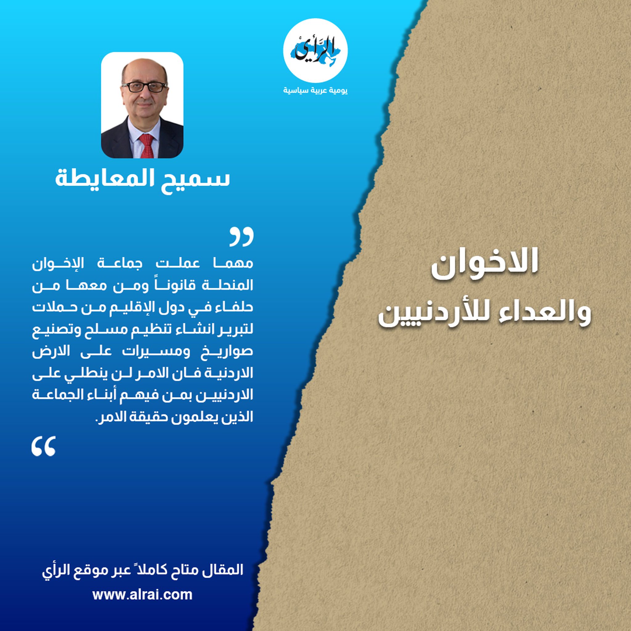 سميح المعايطه مهما عملت جماعة الإخوان المنحلة قانوناً ومن معها من حلفاء في دول الإقليم من حملات لتبرير انشاء تنظيم مسلح وتصنيع صواريخ ومسيرات على الارض الاردنية فان الامر لن ينطلي على الاردنيين بمن فيهم أبناء الجماعة الذين يعلمون حقيقة الامر.