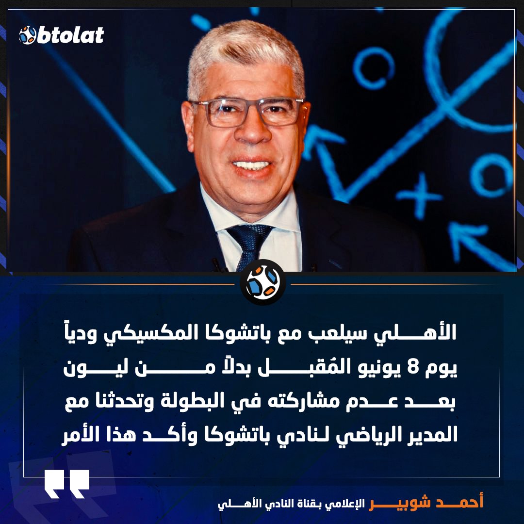 أحمد شوبير: الأهلي سيلعب مع باتشوكا المكسيكي ودياً يوم 8 يونيو المُقبل بدلاً من ليون بعد عدم مشاركته في البطولة وتحدثنا مع المدير الرياضي لنادي باتشوكا وأكد هذا الأمر