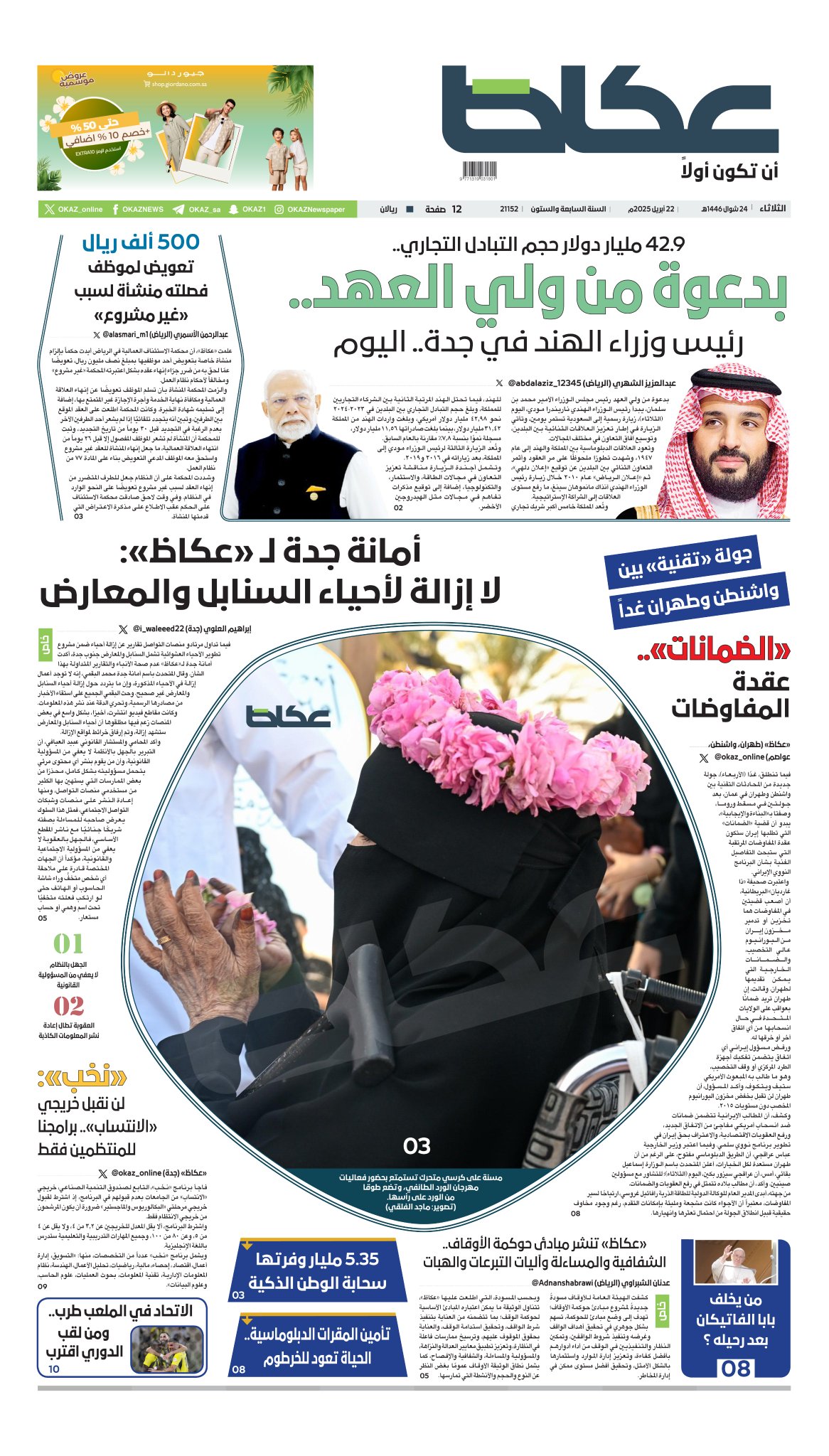 (الصفحة الأولى) الثلاثاء: - بدعوة من ولي العهد.. رئيس وزراء الهند في جدة.. اليوم - أمانة جدة ل«عكاظ»: لا إزالة لأحياء السنابل والمعارض - 500 ألف ريال تعويض لموظف فصلته منشأة لسبب «غير مشروع» - «عكاظ» تنشر مبادئ حوكمة الأوقاف.. الشفافية والمساءلة وآليات التبرعات والهبات - «نخب»: لن نقبل خريجي «الانتساب».. برامجنا للمنتظمين فقط - 5.35 مليار وفرتها سحابة الوطن الذكية