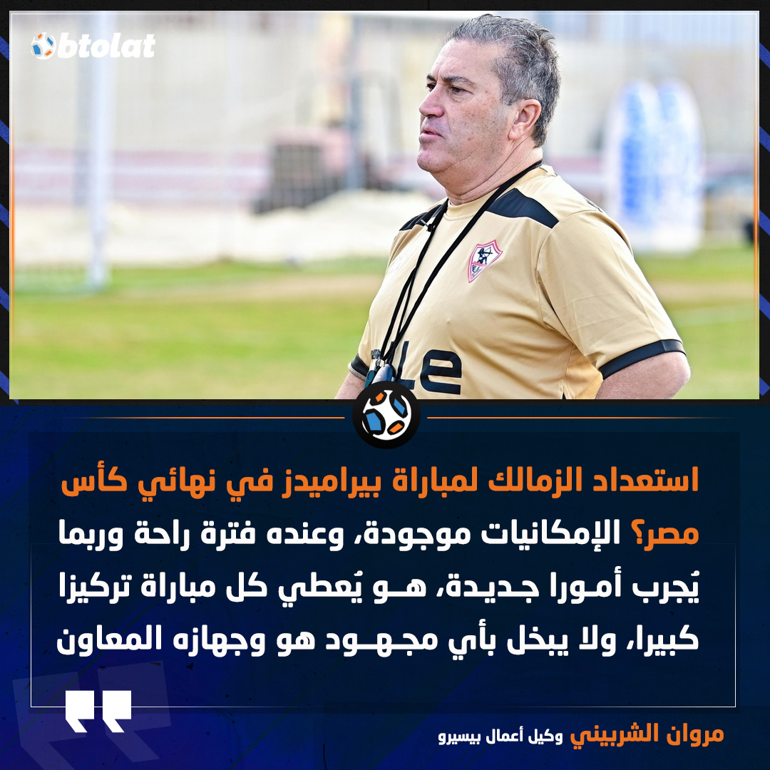 وكيل أعمال بيسيرو عن استعداد الزمالك لمباراة بيراميدز في نهائي كأس مصر. الإمكانيات موجودة، وعنده فترة راحة وربما يُجرب أمورا جديدة، هو يُعطي كل مباراة تركيزا كبيرا، ولا يبخل بأي مجهود هو وجهازه المعاون