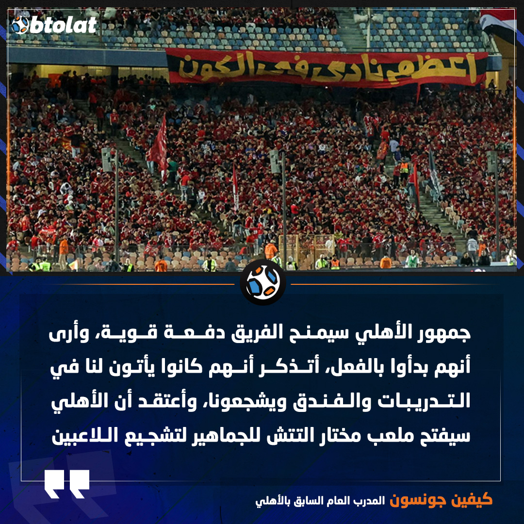 كيفين جونسون. جمهور الأهلي سيمنح الفريق دفعة قوية، وأرى أنهم بدأوا بالفعل، أتذكر أنهم كانوا يأتون لنا في التدريبات والفندق ويشجعونا، وأعتقد أن الأهلي سيفتح ملعب مختار التتش للجماهير لتشجيع اللاعبين