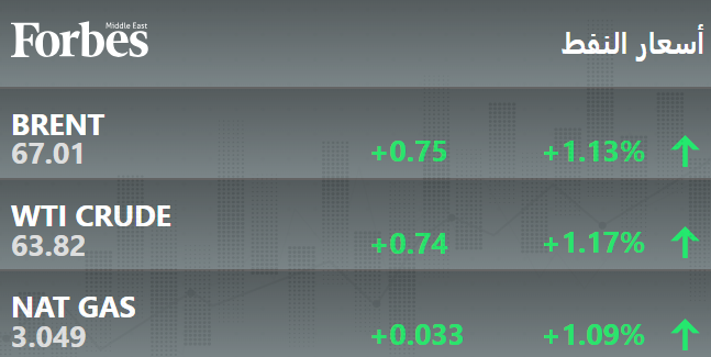وصعدت العقود الآجلة لخام برنت 68 سنتًا أو ما يعادل 1% لتسجل 66.9 دولار للبرميل. كما ارتفعت العقود الآجلة لخام غرب تكساس الوسيط الأميركي بمقدار 68 سنتًا أو 1% إلى 63.7 دولار.