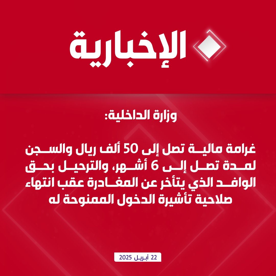 غرامة 50 ألف ريال والسجن لمدة تصل إلى 6 أشهر، والترحيل بحق الوافد الذي يتأخر عن المغادرة عقب انتهاء صلاحية تأشيرة الدخول الممنوحة له #الإخبارية