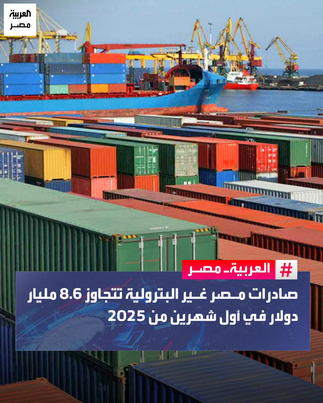 حصري.. صادرات مصر غير البترولية تتجاوز 8.6 مليار دولار في أول شهرين من 2025 _مصر ارتفعت صادرات مصر غير النفطية 29% إلى 8.67 مليار دولار خلال شهري يناير وفبراير الماضيين، مقابل 6.72 مليار دولار في الفترة نفسها من 2024، بحسب وثيقة حكومية اطلعت عليها "العربية".. تصدَّر قطاع مواد البناء والصناعات المعدنية قائمة القطاعات الأعلى تصديراً خلال أول شهرين من العام الحالي، بصادرات قيمتها 3.17 مليار دولار، مقابل 1.33 مليار دولار في الفترة نفسها من 2024، بنمو 138%.. في المركز الثاني جاء قطاع الصناعات الكيماوية والأسمدة بصادرات قيمتها 1.29 مليار دولار، مقابل 1.36 مليار دولار في يناير وفبراير من العام الماضي، بتراجع 6%