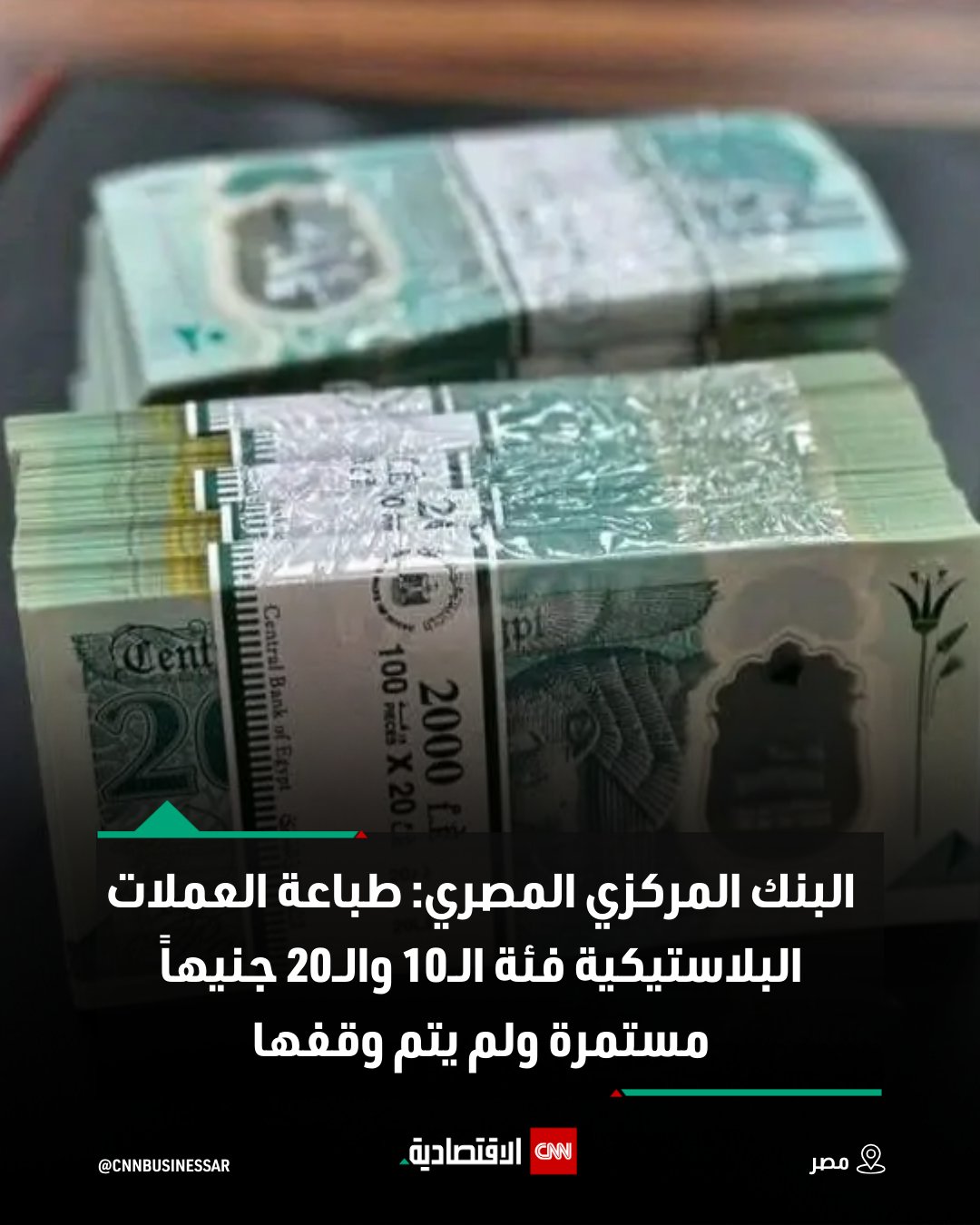 أكد البنك المركزي المصري أنه لم يتم وقف طباعة العملات البلاستيكية فئة ال10 وال20 جنيهاً، وبخصوص صورة العشرة جنيهات الورقية المتداولة على بعض وسائل التواصل الاجتماعي، ويظهر عليها تاريخ طباعة حديث، يؤكد البنك المركزي استمرار تداول جميع العملات النقدية فئة العشرة والعشرين جنيهاً جنباً إلى جنب سواء البلاستيكية (المصنوعة من البوليمر) أو الورقية. #العالم_بلغة_الأعمال