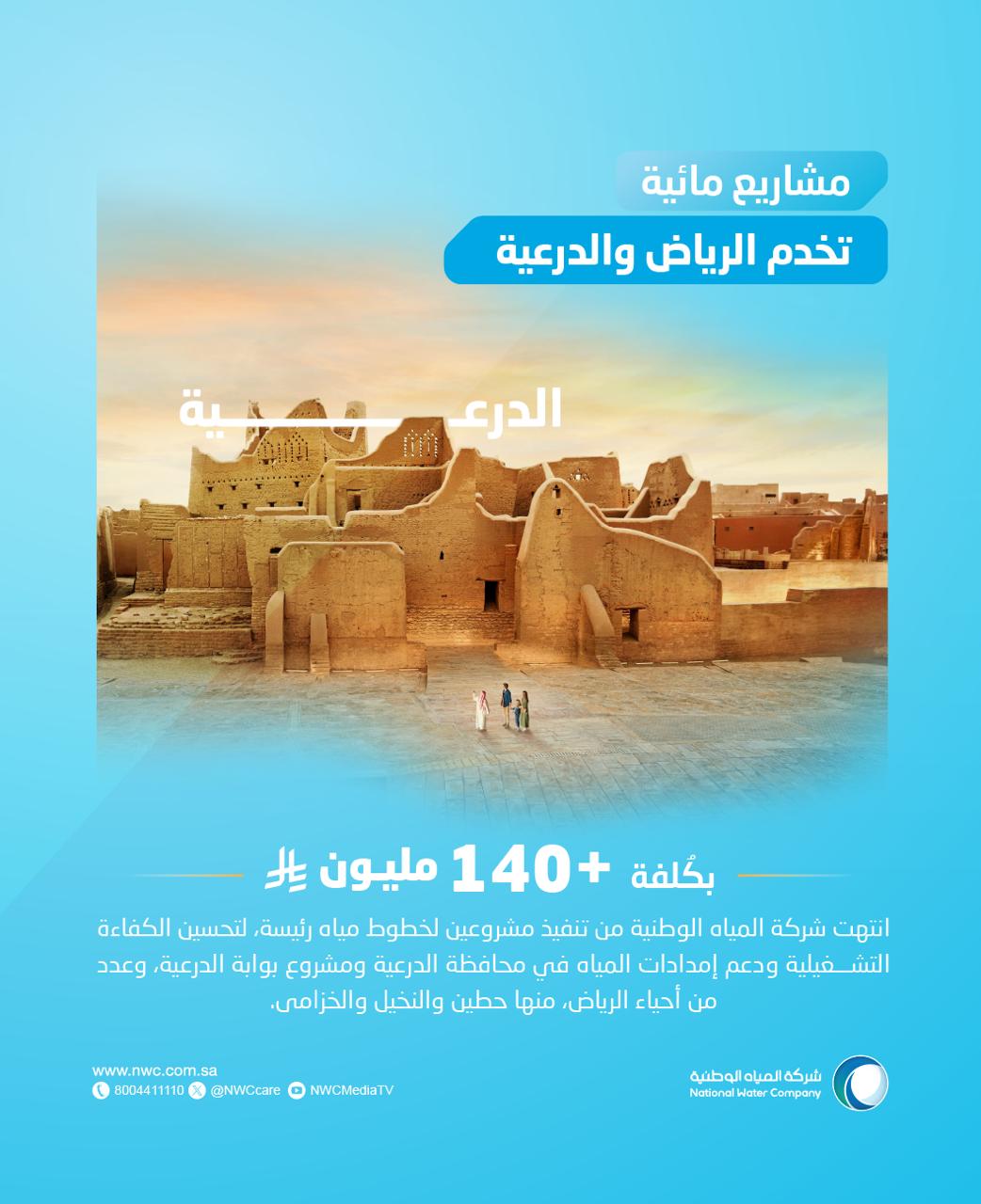أنهت شركة المياه الوطنية تنفيذ مشروعين لخطوط مياه رئيسة في محافظة الدرعية بمنطقة الرياض، بكُلفة إجمالية تجاوزت 140 مليون ريال، وبأطوال إجمالية تجاوزت 26 كيلومترًا، وذلك ضمن جهود الشركة المستمرة؛ لتعزيز البنية التحتية في كلٍ من قطاعي المياه والخدمات البيئية، واستكمال مبادراتها الهادفة إلى رفع نسب تغطيتها بالخدمات التي تقدمها لعملائها.